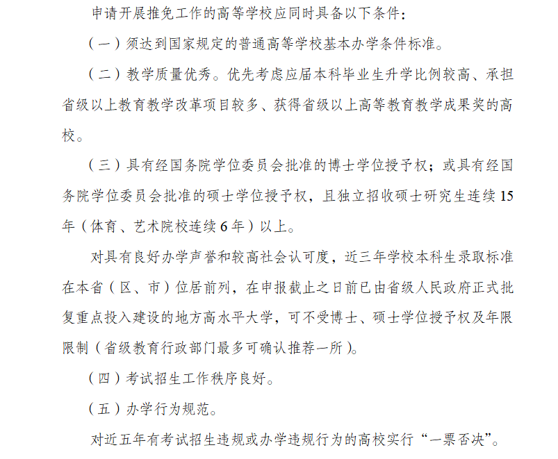 根据2006年教育部发布的《全国普通高等学校推荐优秀应届本科毕业生免试攻读硕士学位研究生工作管理办法(试行)》规定,开展推荐工作的高等学校应具备以下条件:(一)教学质量优秀。(二)具有经国务院学位委员会批准的博士学位授予权;或具有经国务院学位委员会批准的硕士学位授予权,且独立招收硕士研究生连续15年(体育、艺术院校连续6年)以上。(三)招生工作秩序良好。(四)办学行为规范。