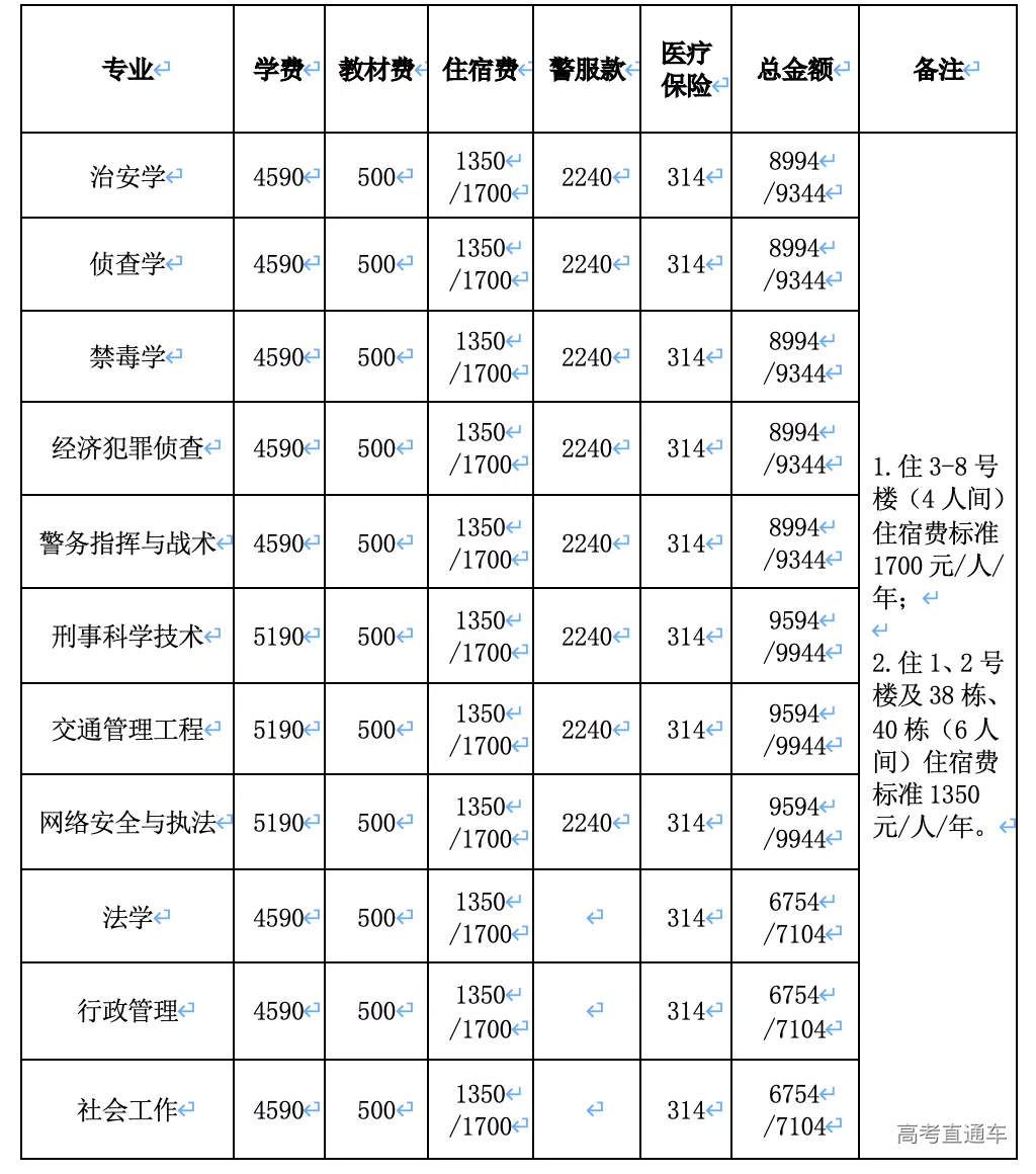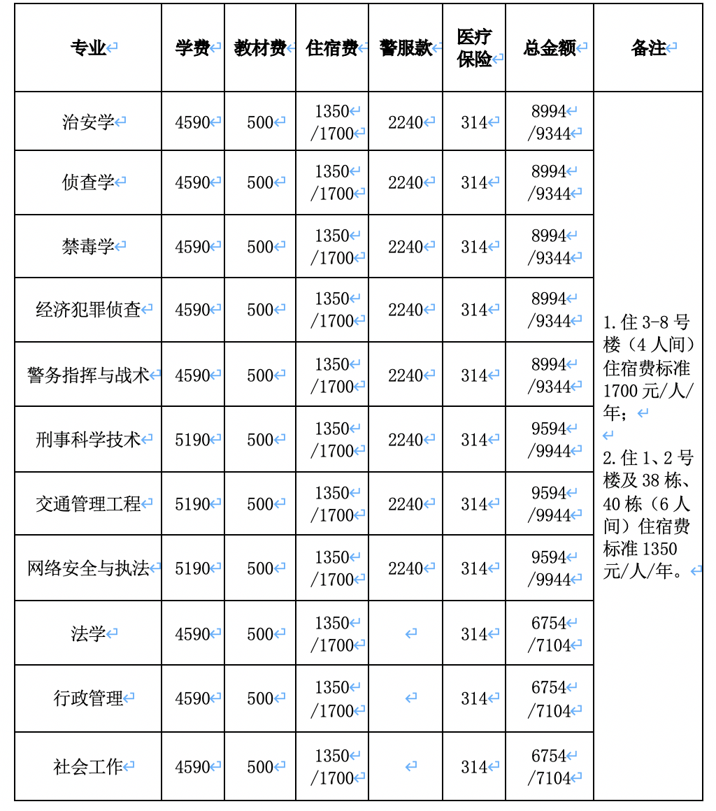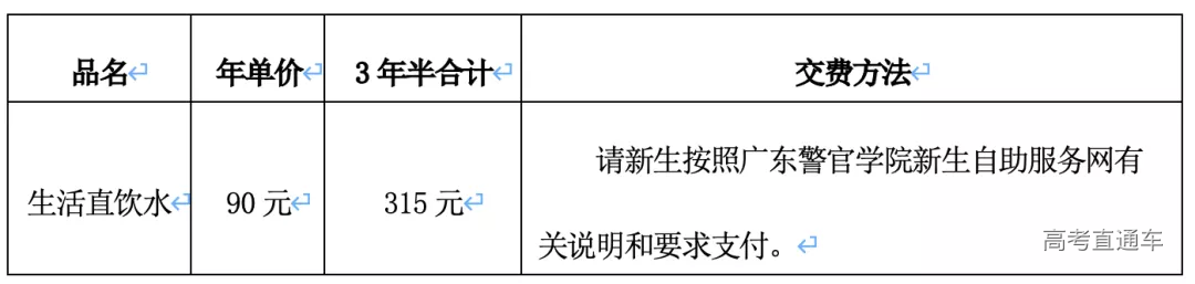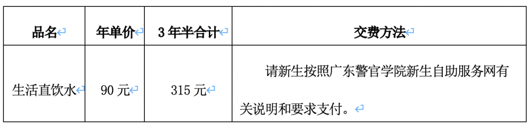 ▲特别说明:此表费用不包括学生直饮水和生活用品费用。公安类专业和普通类专业学生,均要按照广东警官学院新生自助服务网有关说明和要求另行支付。