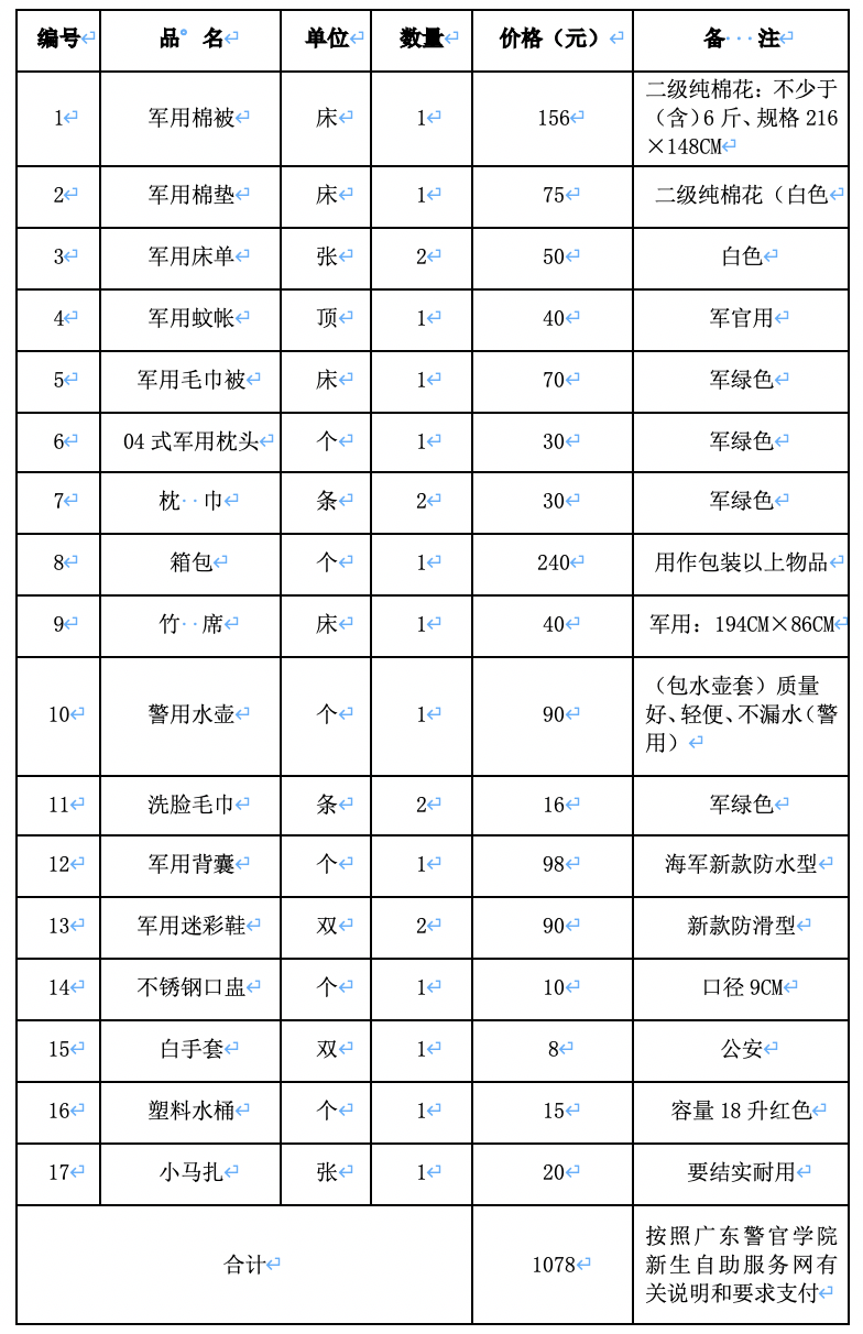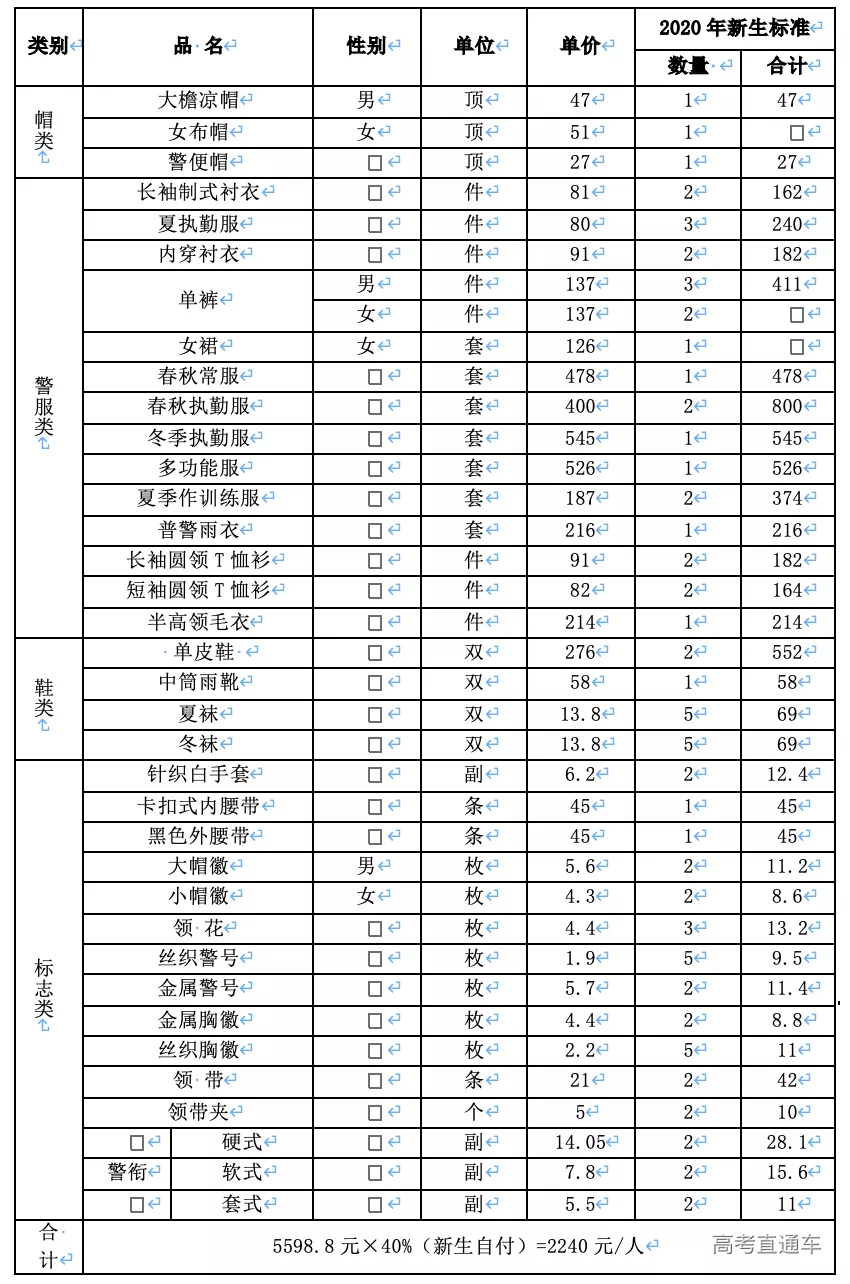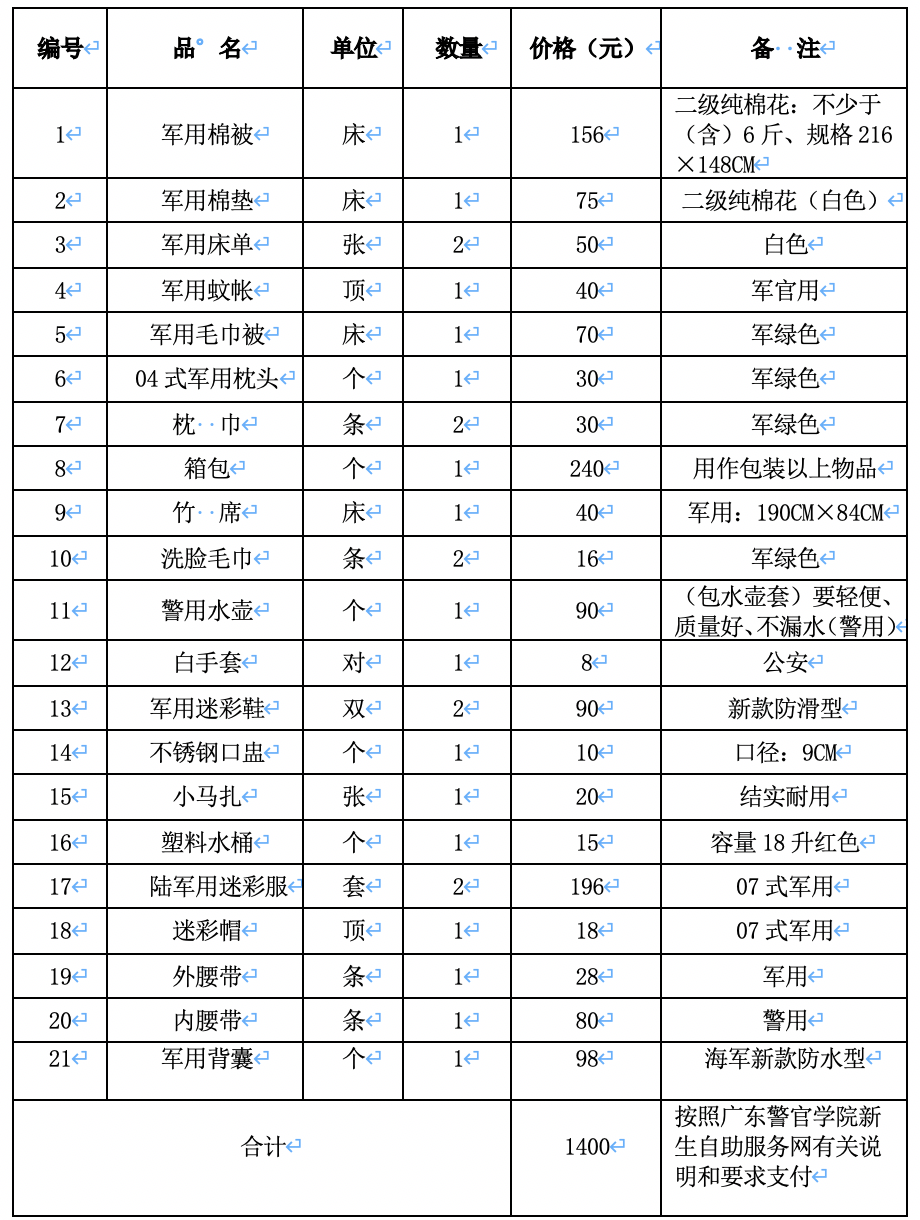 新生警服、标志清单及费用