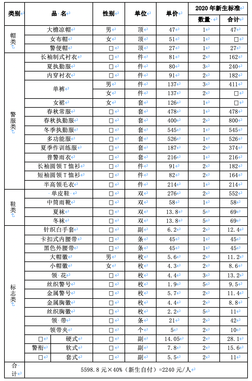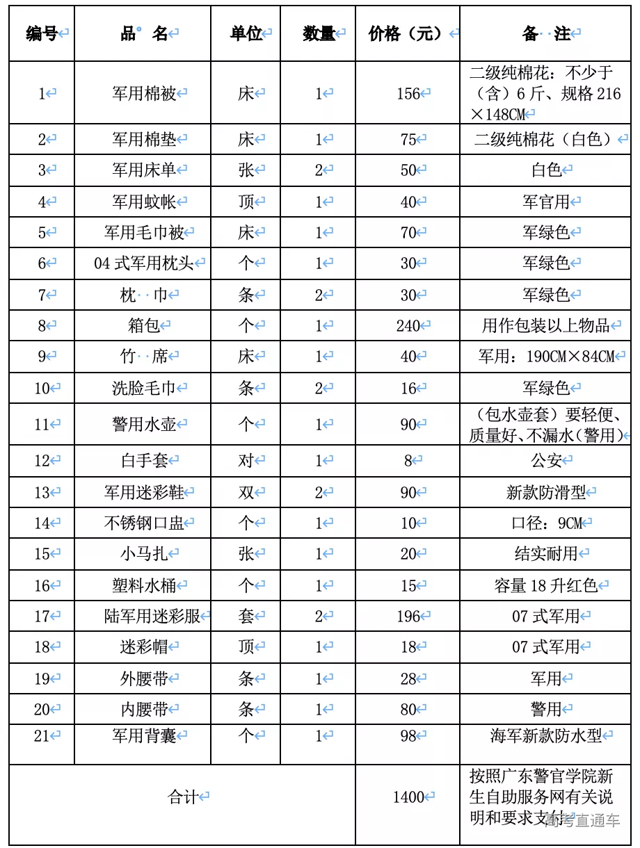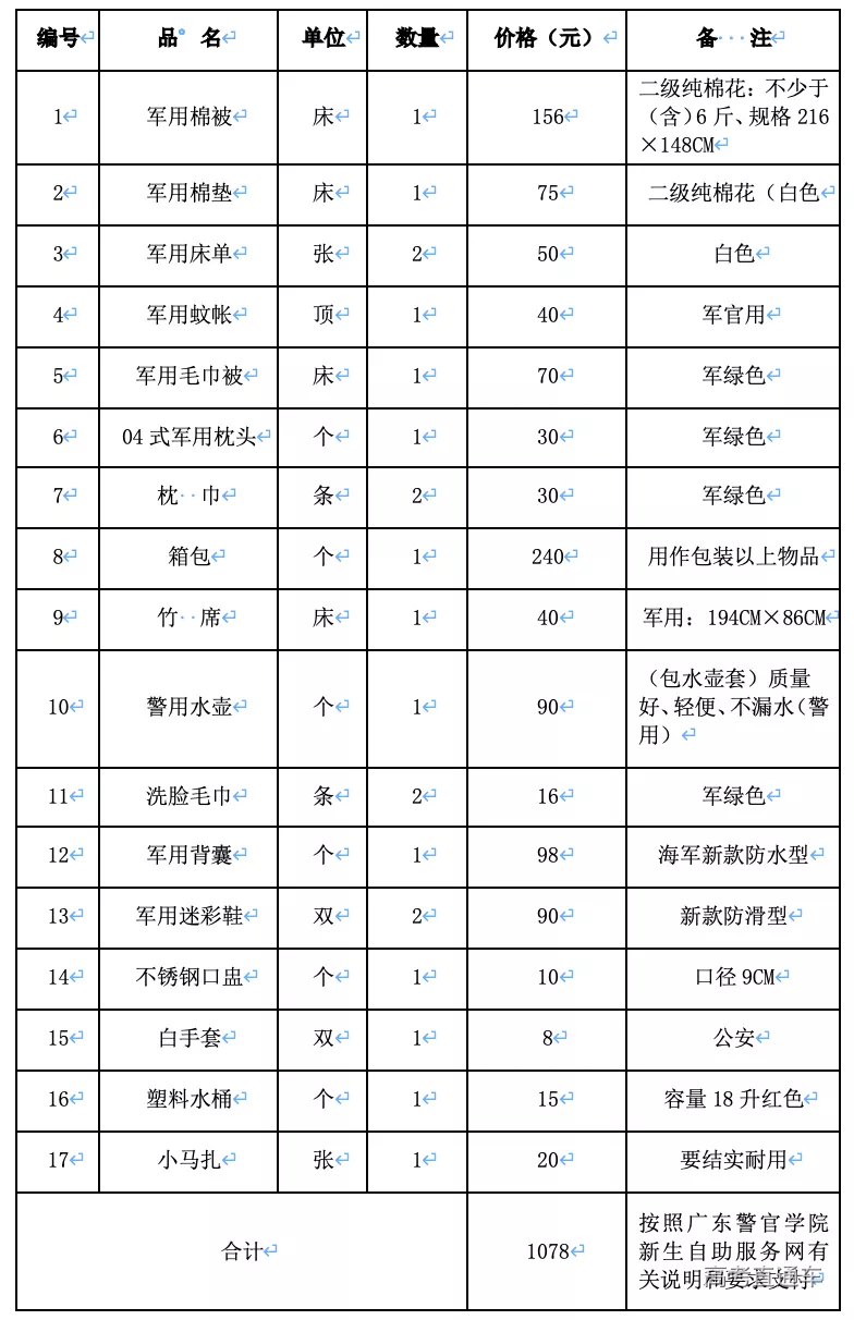 新生警服、标志清单及费用