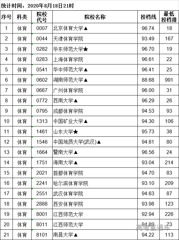 参加第一批本科体育类录取的院校21 所,全部投档满额,投档专业分数居前的院校分别是: