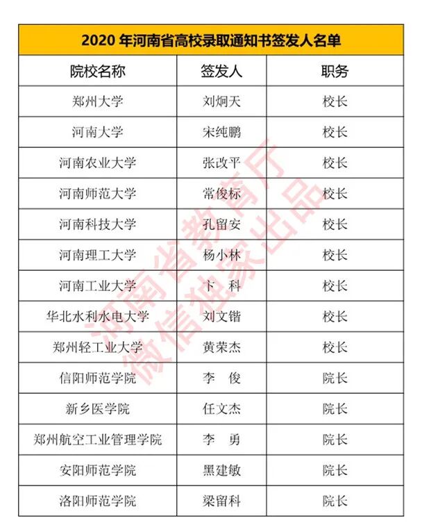 2020年河南省普通高校招生录取工作正在有序进行中,录取通知书作为学校给你的第一张名片,具有重要的意义。先一起来看看你的通知书都是谁签发的吧!