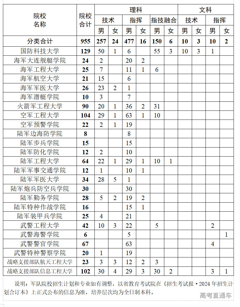 根据教育部和中央军委政治工作部、训练管理部《关于印发〈2024年军队院校招收普通高中毕业生计划〉的通知》(军训〔2024〕81号),今年25所军队院校计划在川招收普通高中毕业生955人(详见附件)。为圆满完成招生任务,现将有关事项通知如下: