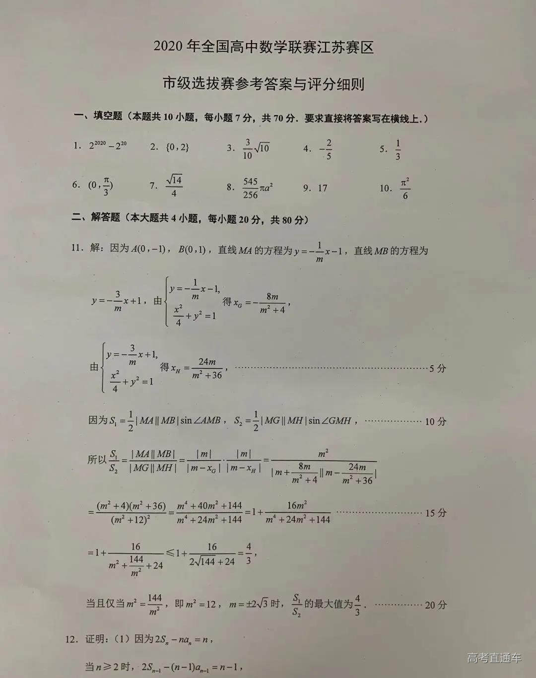 江苏省2020年全国高中数学竞赛初赛考试已经结束,小编收集整理江苏省2020年全国高中数学竞赛初赛试题答案,供参考。