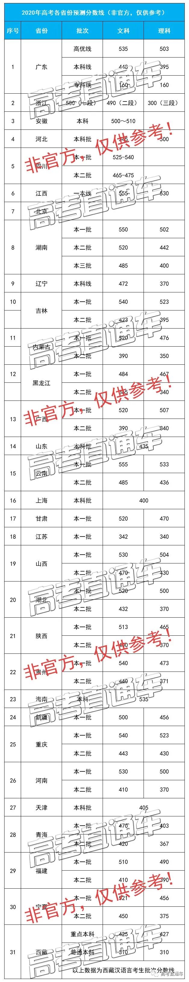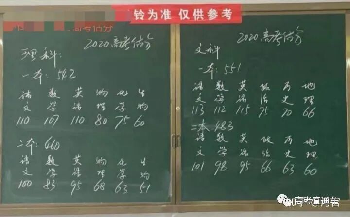 特别说明:本文高考预测分数线,由各地网友或老师预测,仅供考生/家长参考,不具有实际指导意义。高考直通车将在官方消息公布后及时推送官方版2020高考录取分数线,敬请关注,提前关注高考直通车微信号即可第一时间获取最新动态。 (来源:微博乐云) 我们还收集整理了一些网友对于今年分数线的预测: 预估530,感觉数学和2019年相比不是同一个档次,应该要难10分,理综基本持平,英语也要难10分左右。 小车再次提醒,以上由各地网友或老师预测,仅供考生/家长参考,不具有实际指导意义。而且各个省份的划线都不一样,所以大家还是要耐心等待自己省份最后的官方通知。 你是哪个地区的考生? 你觉得今年的分数线是多少? 2020年高考录取分数线变化预测 今年的录取分数线比较难以预测,按正常情况,如果今年的考题难度降低,考生高考分数普遍很高,那么录取分数线自然会提高。如果今年的考题难度增加,考生高考分数普遍降低,那么录取分数线自然会降低。 但是,由于疫情影响,参加高考的学生在校接受的大强度模拟考试减少,在招生总人数变化不大的前提下,如果考题难度与去年持平的话,预测今年的录取线较去年会有以下变化: 1、第一种变化:两极分化 专科录取分数线会较去年降低15分以上、二本分数线会较去年降低5-10分、一本分数线会较去年提高5分左右,211、985院校的录取分数线会较去年提高10分以上。 2、第二种变化:专科、二本院校明显降低,一本及211、985院校持平 专科及二本院校录取分数线明显降低,专科预测降低25分左右,二本录取分数线降低10分左右;一本及211、985院校与去年持平。 3、第三种变化:专科、二本院校降低明显,一本及211、985院校小幅度降低 专科录取分数线降低35分左右,二本录取分数线降低15分左右;一本降低5-10分,211、985院校降低5分左右。 综合上述分析,今年专科及二本录取分数线会降低,幅度在10-30分左右;一本及211、985院校的录取分数线会有小幅度降低或与去年持平。 再次,要明确自己在全省考生中的大概排名。每年招生录取季,各地招生考试部门都会在公布高考成绩的同时,公布“一分一段表”。之所以公布这个表,是为了让广大考生对照自己的成绩、明确自己在全省的排位。而知道这个排位,对于志愿填报的意义,比分数更重要! 1、作文估分 语文科目的作文,占60分。在没有写跑题的情况下,考生可参照平时模拟考试时的作文成绩估分,区间一般会在45-50之间。 英语比较难估的也是作文,建议按照自己平时的情况估分,平时成绩较好的考生可以打高一点儿。 在高考所有科目中,也许语文最难估了。主要是因为它的客观题少主观题太多,特别是作文,高考语文如何才能比较客观地估分呢?下面给大家提供几点思路供考生和家长参考: ①一定要细读高考标准答案,最好把答案的得分点分析出来; ②努力回忆自己答题的情况、情景; ③不要拘泥于答案估分; 因为语文中的文言翻译、诗歌鉴赏、现代文阅读问答题和语言操作题都不是死扣答案给分的,这样的试题实际上没有考生能作出与“标准答案”一模一样的答案,根据平时阅卷的体会,评分主要依据意思与答案的接近性、要点的完整性和清晰性以及语言表述的规范性等综合因素给分。 ④作文估分在确认审题立意没有偏离的情况下相对于平时考试不宜保守。一般而言,平时是严格要求,高考作文阅卷是鼓励性从宽原则。实际情况是很多人的高考作文得分比平时要略高一些。当然,这不绝对。实际上,在高考评卷中一等、四等作文都相对较少,多数都是二、三等。 ⑤如果你通常的作文成绩比较稳定,在没有写跑题的情况下,可以选择折中的办法。可以以42-45分为基准分进行适当加减。 ⑥语言等各方面是否到位、有没有特色。如果有某一亮点,估分可以适当加5--8分。 ⑦估分时可以参考自己平时的作文成绩,比如如果自己书写一直就很潦草,可以减掉3--5分。 ⑧最好请老师来把关 语文老师对你的语文基础最清楚,你可以就某个主观题的估分和老师交换意见;可以列出自己作文的思路提纲,可以讲自己作文的内容、材料、构思、文体等等。老师会结合你平时的情况给你一个比较符合实际的建议。 选择题和填空题主要是凭自己记住的答案来估。 解答题估分有一定的讲究,如果这道题的结果和答案是吻合的,考生还要看看所做的方法与答案采用的方法是否相同,如果有所不同,一定要征求老师的意见,不要简单地认为只要答案对了就是满分,而忽视答题步骤。大题的估分,要按步骤算分,一定是步骤真正出现了再给分,如果不出现,阅卷老师不会给分。另外,有的考生会认为只要结果错了,就不能得分,这样会使估分偏低。事实上,数学更注重答题的过程,有可能计算过程都对了,只是答案错了,因此考生在估分时要注意参照标准答案的步骤和程序。 英语的客观题估得准不准全凭考生记得如何了,比较难估的恐怕也是英语作文了。建议考生在对作文进行估分时,最好按照自己平时的情况,即取平时作文的平均得分,必要时可参考老师的意见估分。 估作文时要认真阅读评分标准,首先要客观地确定自己作文的等级,否则估出的分数和实际得分差距可能就会很大。考生注意核实一下作文中的硬性要求是否都已达到,如字数、要求涵盖的内容等。 解答过程完整会得高分,物理在估主观题的分数时应注意原始公式