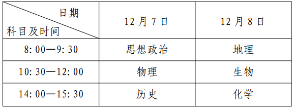 1、全省统一考试科目为:思想政治、历史、地理、物理、化学和生物。上述科目考试日期安排在12月的第一个双休日,具体安排如下: