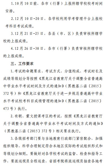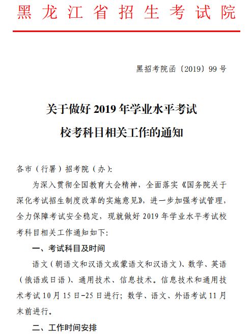 2、地市组织实施的考试科目为:语文(朝语文和汉语文或蒙语文和汉语文)、数学、英语(俄语或日语)、通用技术、信息技术。语文、数学和外语学科考试在11月末前进行;通用技术和信息技术考试在10月15日-25日进行。