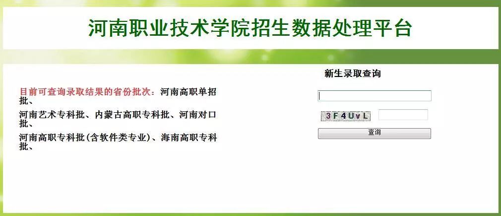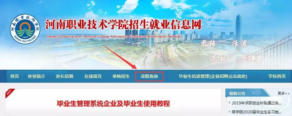 登陆河南职业技术学院官网(http://www.hnzj.edu.cn/),点击导航栏“招生就业”,进入学院招生信息网,点击“录取查询”,进入查询界面,考生可进行查询。