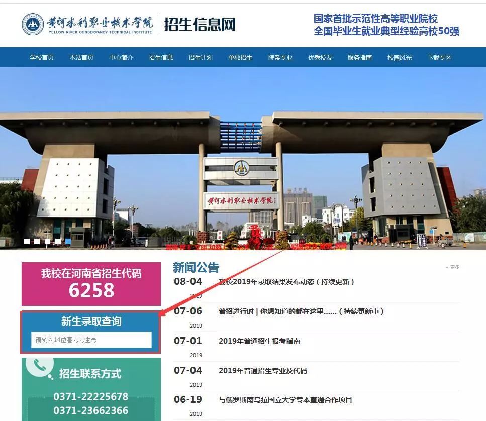 登陆黄河水利职业技术学院官网(http://www.yrcti.edu.cn/),点击导航栏“招生就业”,进入学院招生信息网,点击“新生录取查询”,进入查询界面,考生可进行查询。