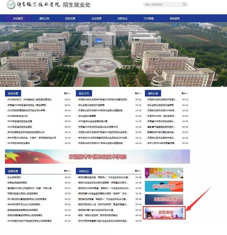 登陆许昌职业技术学院官网(http://www.xcitc.edu.cn/),点击导航栏“招生就业”,进入学院招生信息网,点击“录取查询”,进入查询界面,考生可进行查询。