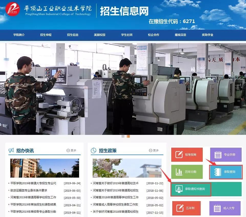 登陆平顶山工业职业技术学院官网(http://www.pzxy.edu.cn/),点击导航栏“招生就业”,进入学院招生信息网,点击“录取查询”,进入查询界面,考生可进行查询。