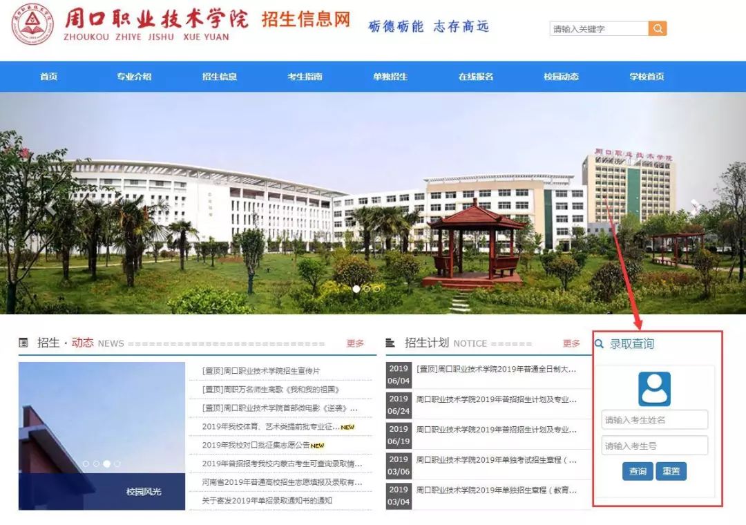 登陆周口职业技术学院官网(http://www.zkvtc.edu.cn/),点击导航栏“招生就业”,进入学院招生信息网,点击“录取查询”,进入查询界面,考生可进行查询。