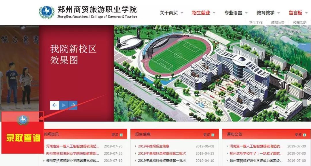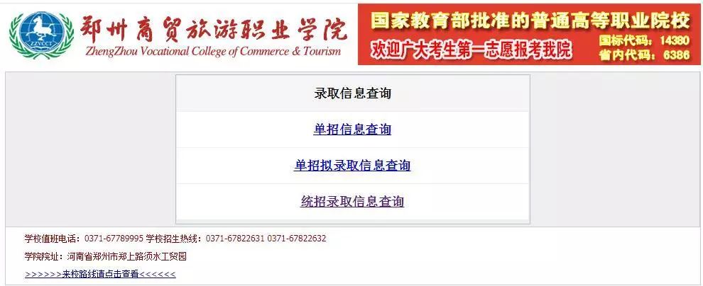 登陆郑州商贸旅游职业学院官网(http://www.zzvcct.com/),点击“录取查询”,进入查询界面,考生可进行查询。