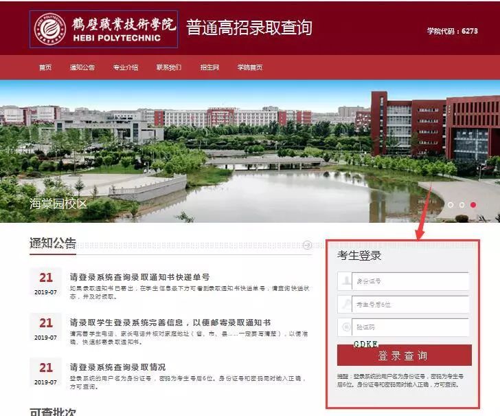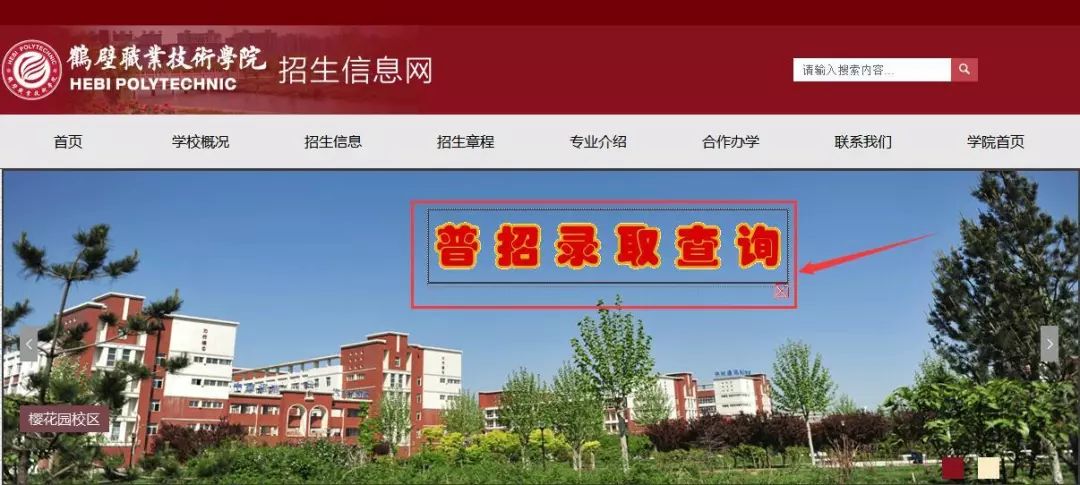 登陆鹤壁职业技术学院官网(http://zs.hbzy.edu.cn/),点击导航栏“普招录取查询”,点击“录取查询”,进入查询界面,考生可进行查询。