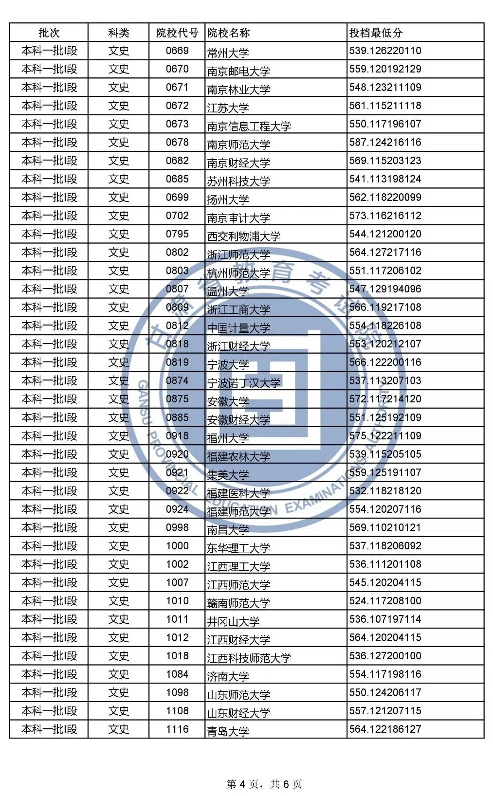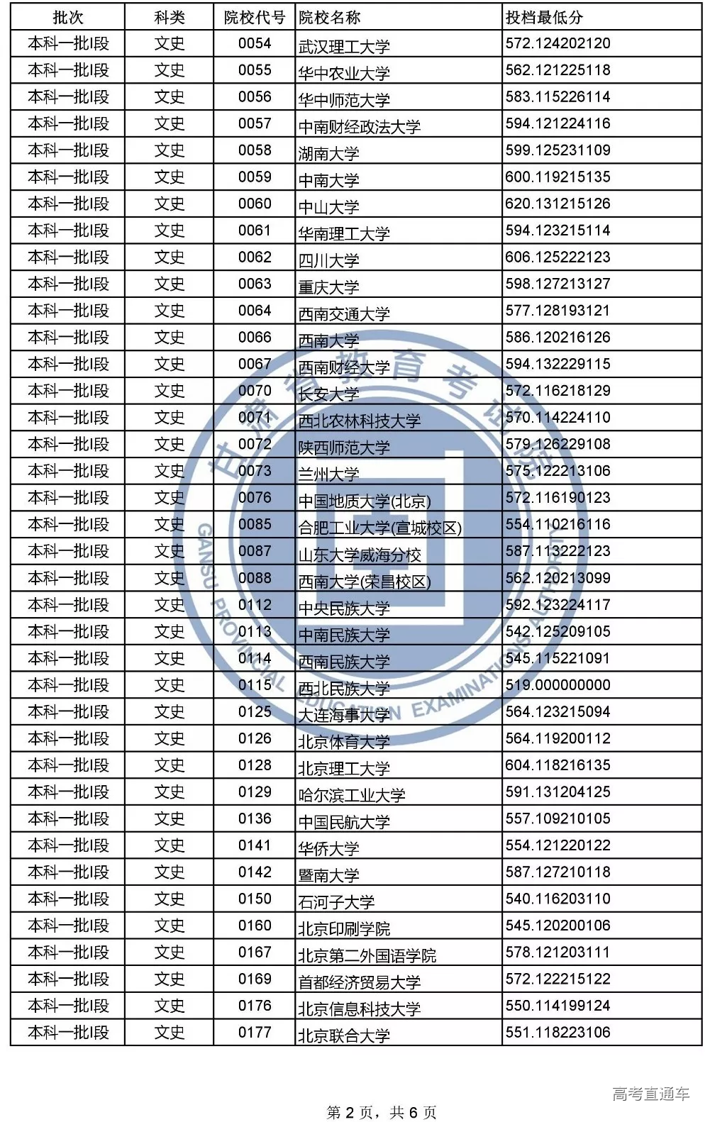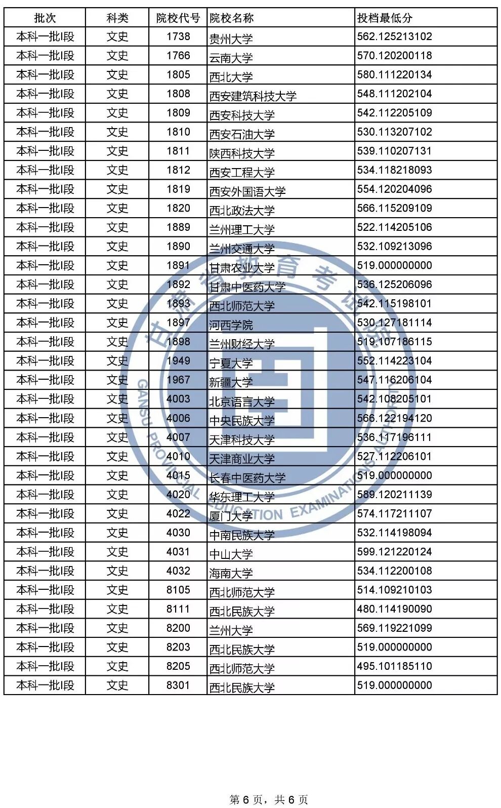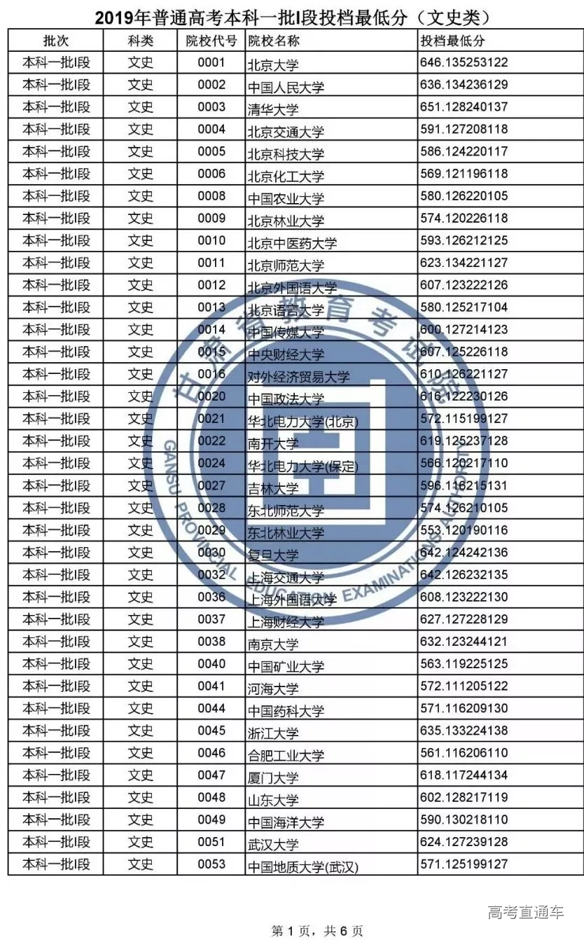 — 说明 — 1.投档最低分含排序分,按考生总分(文化课成绩+照顾政策分)从高到低排序(即:当考生总分相同时比较单科成绩,文史类单科成绩比较顺序依次为:语文、文科综合、数学、外语;理工类单科成绩比较顺序依次为:数学、理科综合、语文、外语)。 2.投档最低分不等于录取最低分。由于平行志愿实行一轮投档,考生档案一旦投出,将不再检索该考生的后续志愿。因此,对于考生来说该轮投档只有一次投档机会。个别考生会因专业不服从调剂或不符合院校相关招生政策等情况被院校退档。 3.部分院校有多种招生类型,同一所院校会出现不同的投档最低分,具体请根据院校代号对照《2019年甘肃省普通高校招生专业目录》。