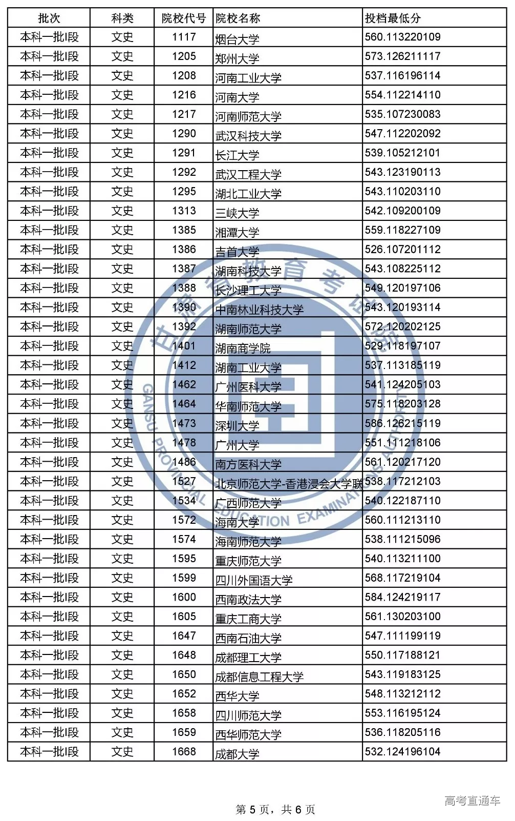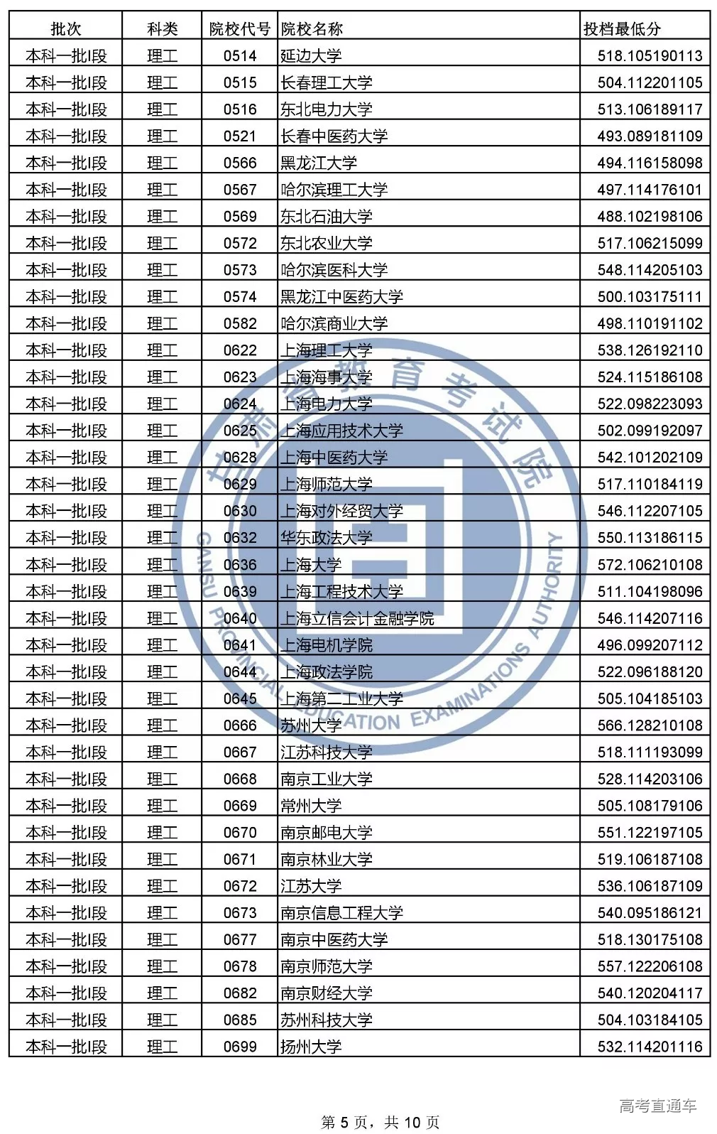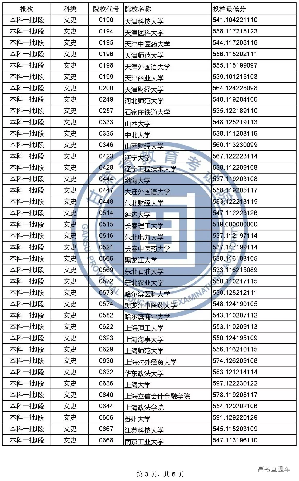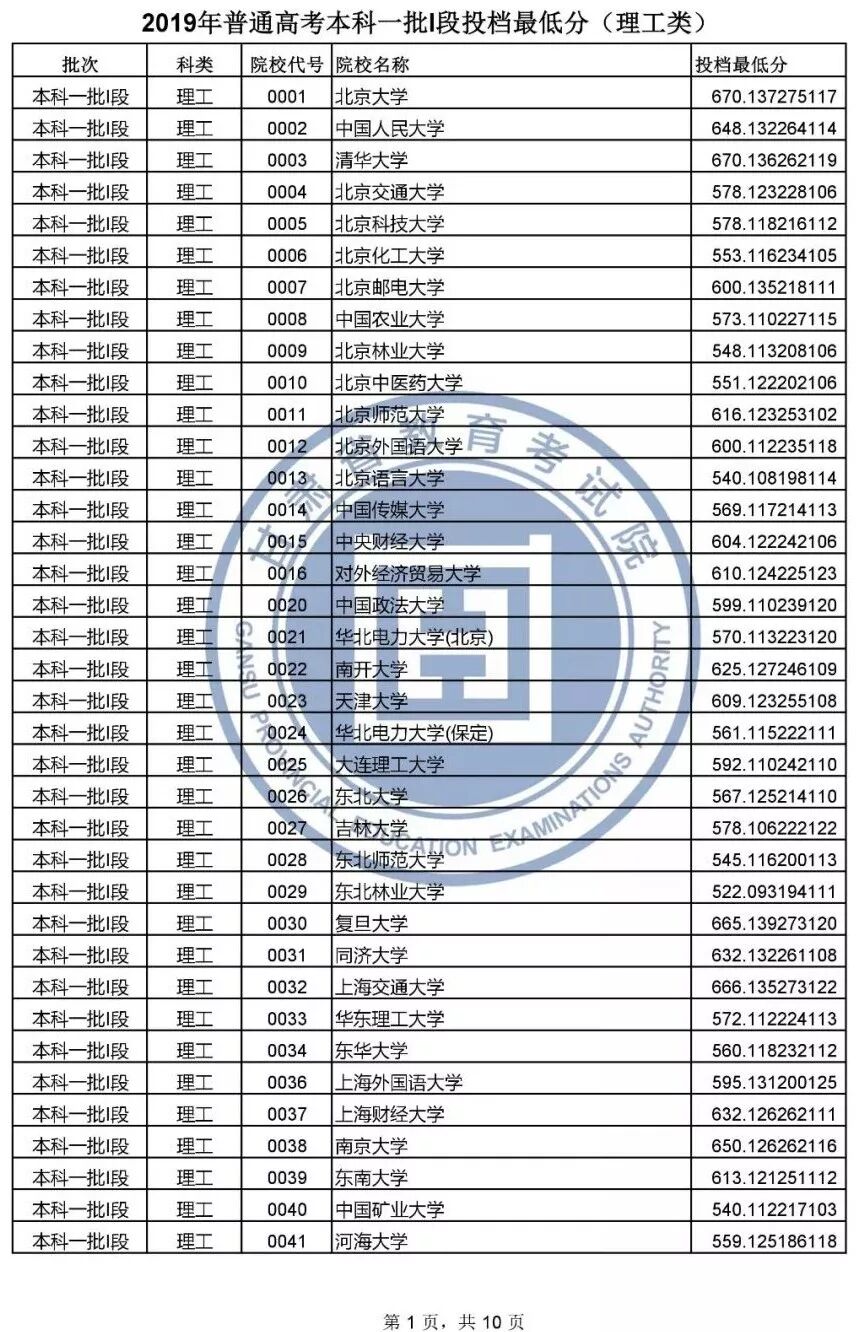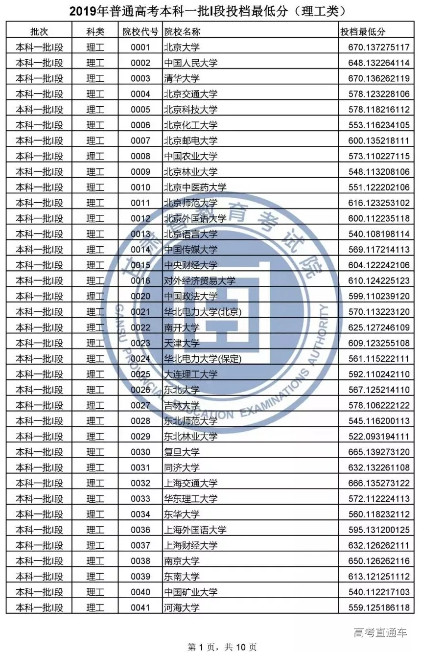 本科一批l段投档文史类和理工类最低分