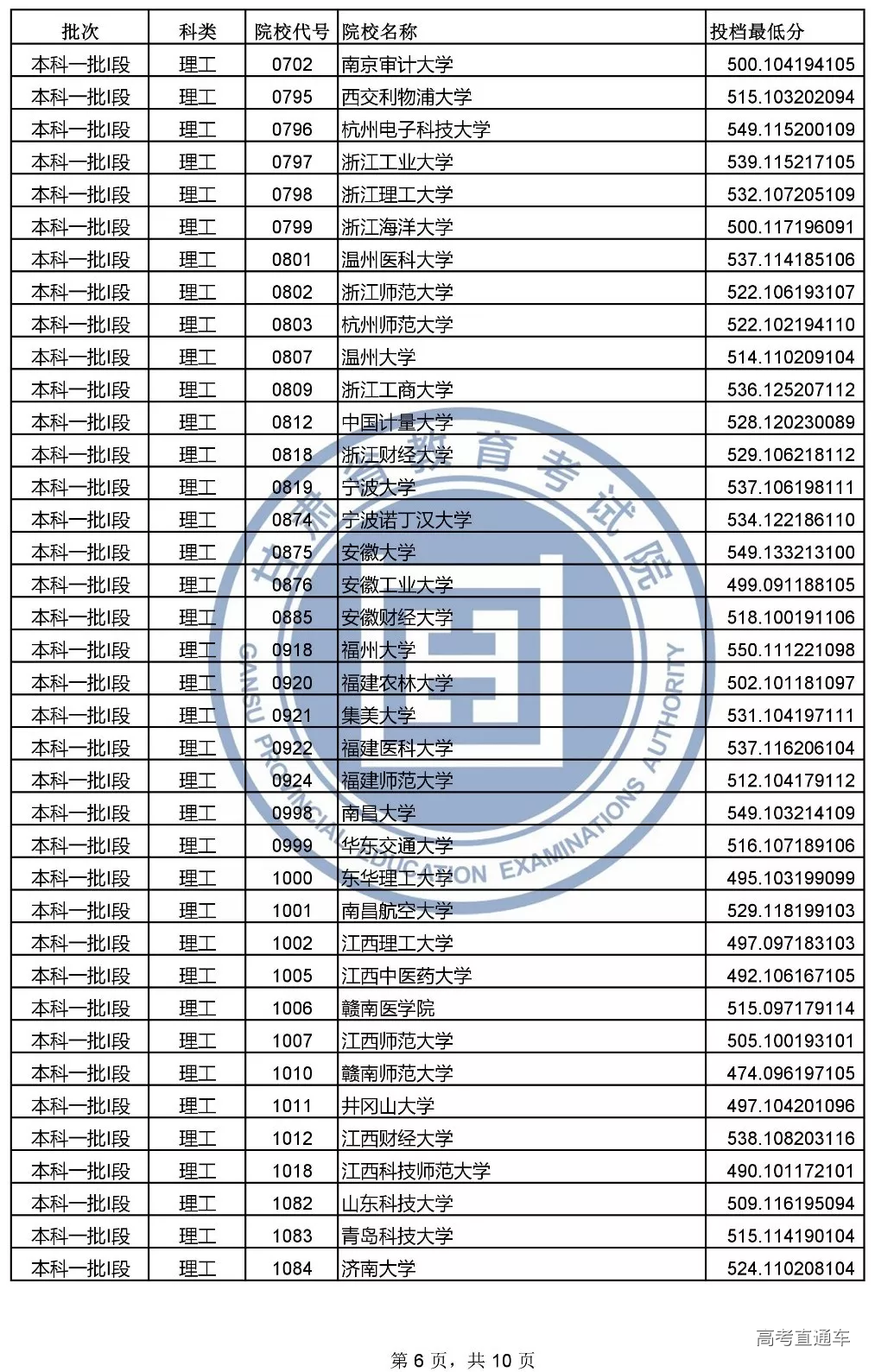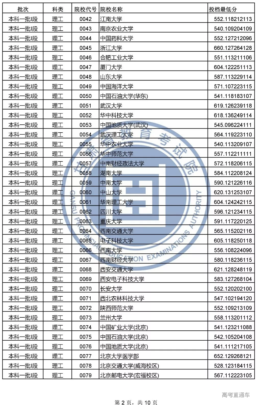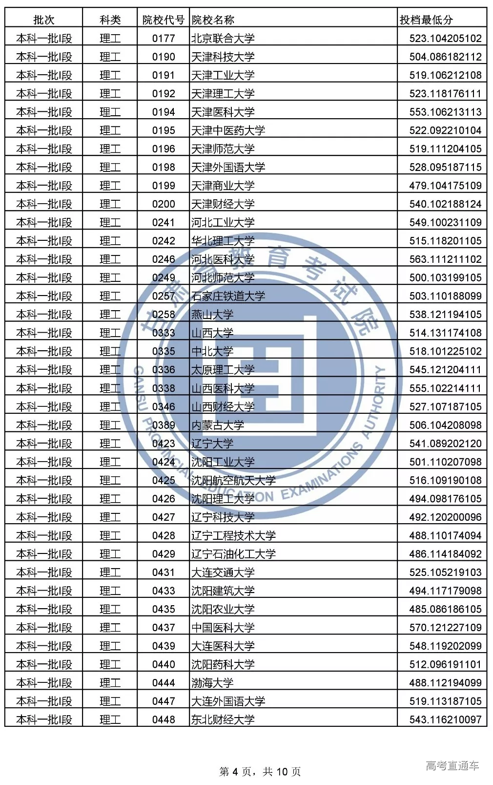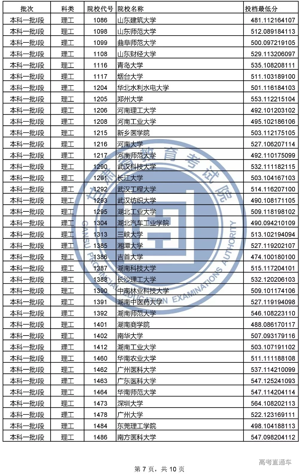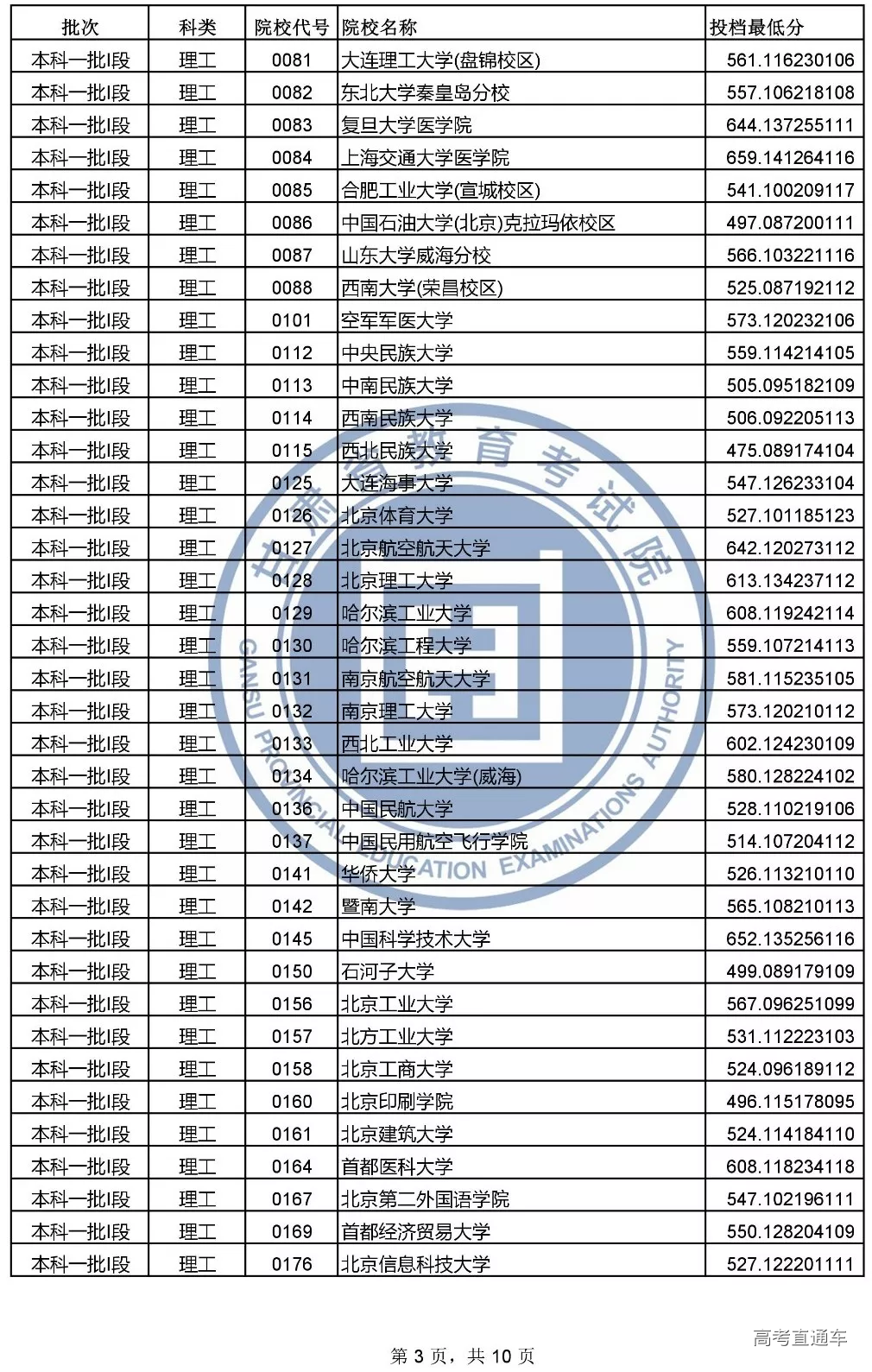 本科一批l段投档文史类和理工类最低分