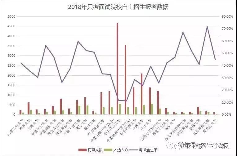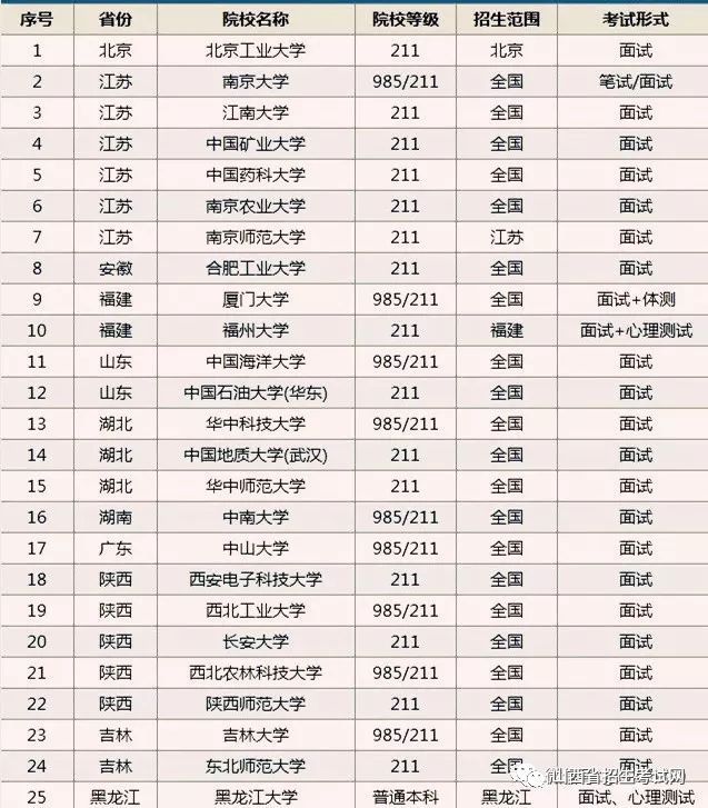 一、只考面试的自主招生院校 自主招生考试形式一般包括笔试、面试及其他特殊测试,整理2018年自主招生只考面试的学校,供参考。 1、2017年有16所高校自主招生只考察面试,2018年增加到25所。面试在自主招生考核中比重越来越大。 2、25所院校中,北京工业大学、南京师范大学、福州大学、黑龙江大学只针对本省招生,其他21所高校面向全国招生。 3、南京大学,初审审核结果为“优秀”的考生参加面试,重点考查相关学科知识储备和专业发展潜力;审核结果为“通过”的考生参加笔试,重点考查运用已有知识综合分析、解决问题的能力。 4、除所列高校外,很有部分院校对奖项高的考生还有特殊优惠,给予五大学科竞赛省一免笔试,通过后优惠幅度也很大。如:哈工大、华南理工、重庆大学、川大、山大等等。 5、部分院校对文科生不同,如西北大学文科生考核方式为笔试+面试,理科生为面试。 二、自主招生报名要求 在25所只考面试的高校中,普遍认可五大学科竞赛奖项,2018年自主招生条件要求统计如下: 1、25所高校奖项等级要求大多数在省二、省三,矿大、南京师大认可江苏省一,北工大、黑大认可市级奖项。 2、除五大学科竞赛外,科创获得奖项也有较高的认可度。 3、以上25所高校,除北京工业大学只招收理科生外,其他高校均有文科招生计划,具体条件参考招生简章。 4、无奖项可关注中国石油大学(华东),该校认可单科成绩优秀的考生,“语文、英语、数学、物理、化学任意一门课程各学期期末考试单科成绩均位于年级前5%”。 三、自主招生报考数据统计 2018年这些院校虽只考面试,但竞争相对压力较小,大多数高校考试通过率在30%以上,普遍高于全国18.5%的水平。 但也存在少部分院校因初审人数较多,导致考试竞争异常激烈,如:华中科技大学、中国地质大学。 虽然高校考核只考面试,考生也不可大意,仍需认真备考。自主招生高校面试通常具有考题灵活、涉及领域广泛的特点,考生备考需注意日常积累。 根据往年经验,在各大高校自主招生面试中,评述社会现象和时事热点的题目占有相当的比重,考生可在考前集中精力备考。