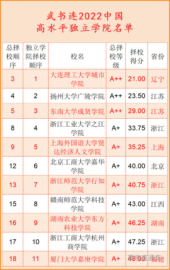 武书连2022中国高水平独立学院名单(共11所,按得分顺序升序排列,得分越小越好):