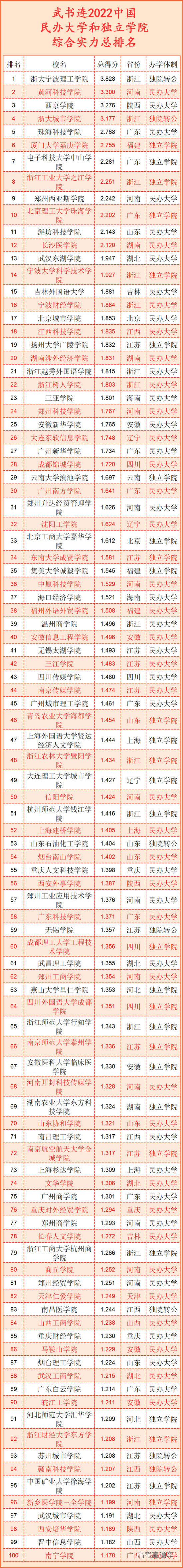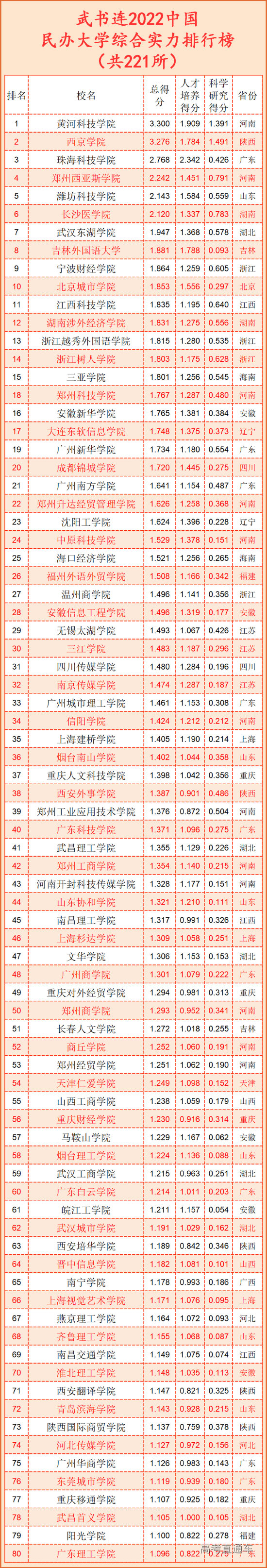 武书连2022中国民办大学综合实力排行榜(共221所)