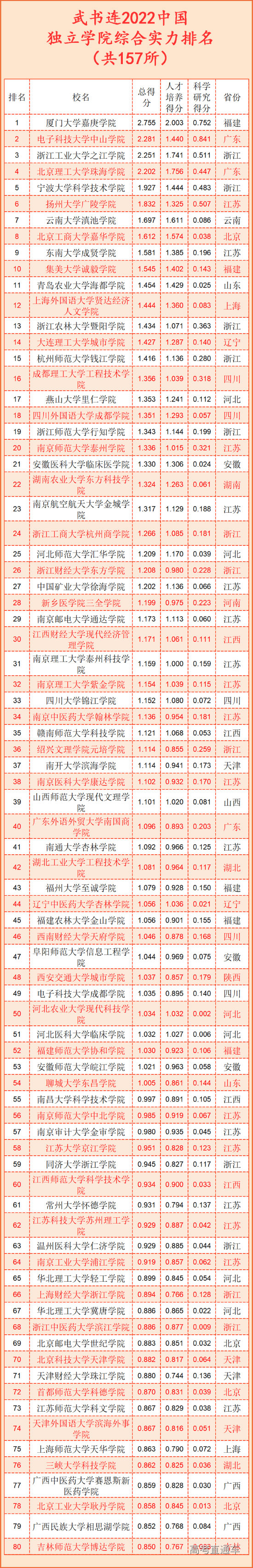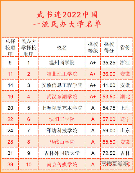 武书连2022年中国一流民办大学和中国高水平独立学院,按择校顺序确定。择校顺序由毕业生就业质量、教师学术水平、教师绩效三项指标排名相加之和确定。
