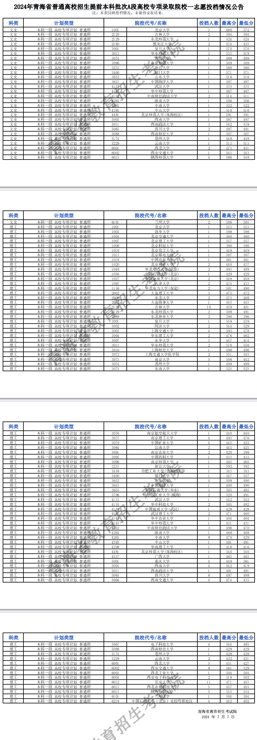 根据青海省公布的2024年提前本科批次A段高校专项录取院校投档情况公告: