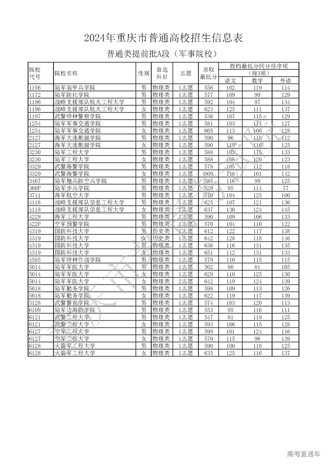 2024年重庆市普通类提前批A段军事院校招生信息表