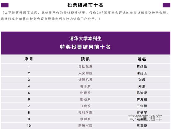 据清华大学,此次公布的投票前十名结果不作为最终获奖结果,仅作为特等奖学金评选的参考材料提交校务会议,最终获奖名单将由校务会议审议确定后在校内信息门户公示。