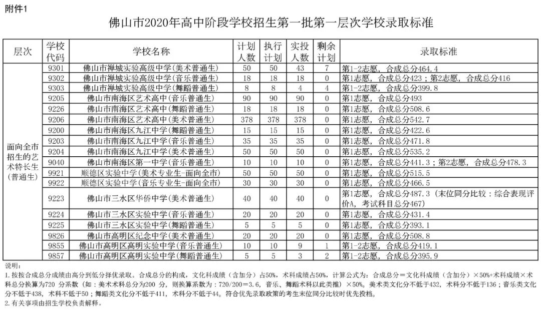 分,则换算系数为:720/200=3.6,音乐、舞蹈术科以此类推)×50%。文化课最低控制线为全市艺术考生文化科平均分线下调50分,术科分最低控制线为市艺术特长生资格线。各学校未完成计划自动收回,转为该校的普通生计划或艺术生计划在后续批次面向区内招生。第一批第二层次学校录取标准