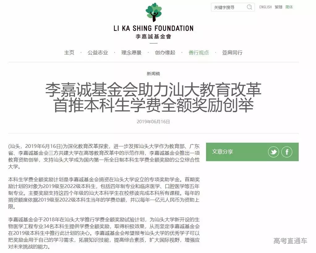 2019年6月16日,汕头大学宣布,李嘉诚基金会将出资支持汕大实施本科生学费全额奖励计划。每年由李嘉诚基金会出资,数额为2019级至2022级本科生的学费总额,上限为1亿元人民币。