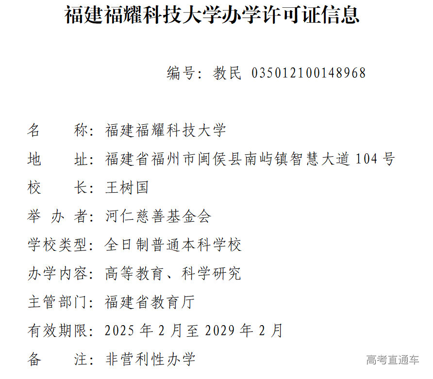省教育厅: 教育部已研究同意设置福建福耀科技大学,学校标识码为4135014896。请你厅按照《教育部关于同意设置福建福耀科技大学的函》(教发函〔2025〕14号)要求,落实好各项工作。 附件:教育部关于同意设置福建福耀科技大学的函(教发函〔2025〕14号) 福建省人民政府办公厅 2025年3月6日 (此件主动公开) 教育部关于同意设置福建福耀科技大学的函 教发函〔2025〕14号 福建省人民政府: 《福建省人民政府关于申请设置福耀科技大学的函》(闽政函〔2024〕48号)和《福建省教育厅关于将拟设置新型研究型大学校名调整为福建福耀科技大学的请示》(闽教发〔2025〕1号)收悉。根据《中华人民共和国高等教育法》《中华人民共和国民办教育促进法》《中华人民共和国民办教育促进法实施条例》《普通高等学校设置暂行条例》有关规定以及第八届全国高等学校设置评议委员会评议结果,经教育部党组会议研究决定,同意设置福建福耀科技大学,学校标识码为4135014896。现将有关事项函告如下。 一、福建福耀科技大学为民办普通本科学校,定位为新型研究型大学,紧紧围绕国家战略和经济社会发展需要,突出理工和科技,着重开展制造业科技创新研究,培养拔尖创新人才,由你省领导和管理。 二、学校要切实加强党的建设,全面贯彻党和国家的教育方针,坚持社会主义办学方向,落实立德树人根本任务,培养德智体美劳全面发展的社会主义建设者和接班人。 三、学校专业设置按教育部有关规定办理,同意首批设置计算机科学与技术、智能制造工程、车辆工程、材料科学与工程等4个普通本科专业。 四、学校全日制在校生规模暂定为8000人。 五、要按照《福建省政府支持福耀科技大学(暂名)提升办学水平实施方案》(闽政〔2024〕10号)明确的工作举措,高质量推进学校建设发展。教育部将适时对文件落实情况进行核验,并将核验结果作为审批你省设立其他高等学校的重要参考。 望你省加强对学校的指导和支持,督促举办者进一步加大办学投入,引导学校按照“高起点、小而精、研究型、国际化”办学定位,聚焦服务国家战略性新兴产业和未来产业发展,大力推进产教融合、科教融汇,集聚一流师资,打造一流学科,培育一流人才,产出一流成果,积极探索新型研究型大学办学模式,为国家和区域经济社会高质量发展作出积极贡献。 附件:福建福耀科技大学办学许可证信息 教 育 部 2025年2月21日 附件