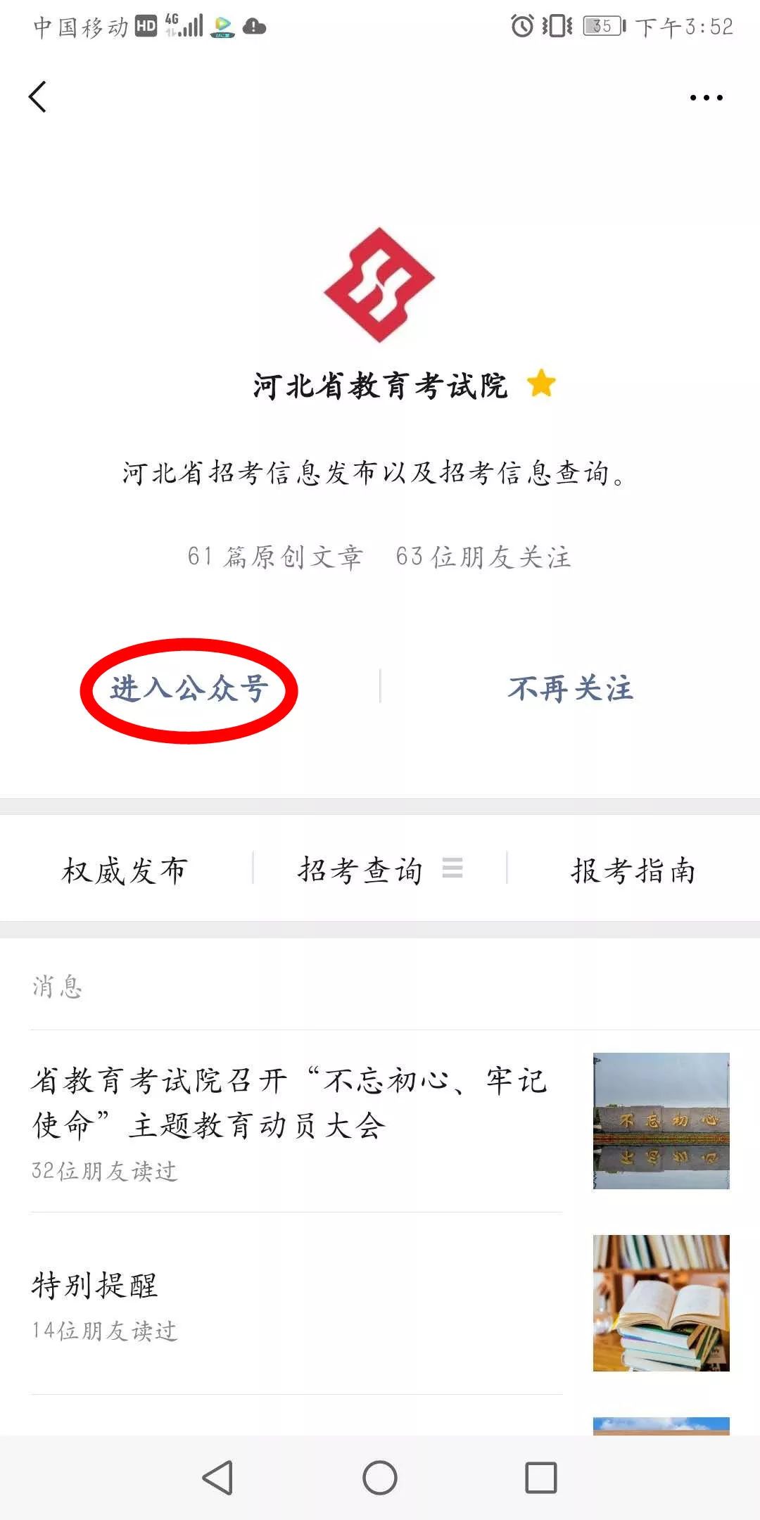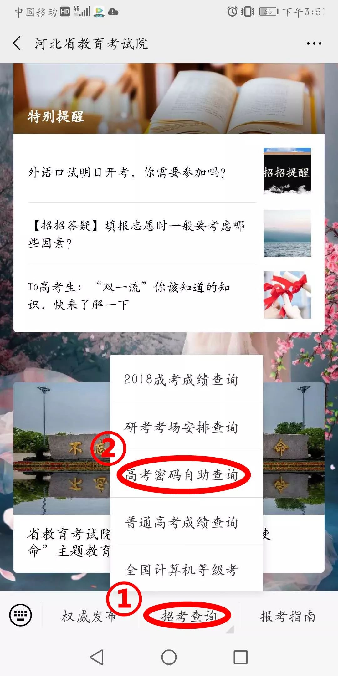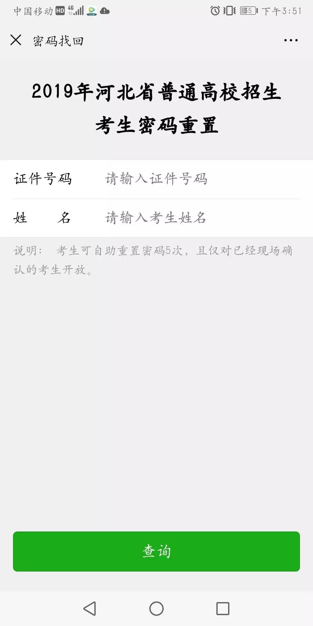 途径一 通过手机微信重置密码 考生使用手机添加“河北省教育考试院”微信公众号,点击下方“招考查询”找到并点击“高考密码自助查询”,进入密码找回页面,通过人脸识别自助进行密码重置。 << 滑动查看下一张图片 >> 途径二 使用能够访问互联网并装有摄像头的计算机,通过人脸识别自助进行密码重置 此方法需要安装人脸认证组件,下载方式及使用说明请通过志愿填报或考生信息查询系统考生登录页面右下角“密码重置”链接进入查看。 << 滑动查看下一张图片 >> 途径三 到就近报名点重置密码 考生携带本人身份证到任一报名点,通过读取身份证、人脸识别完成密码重置。
