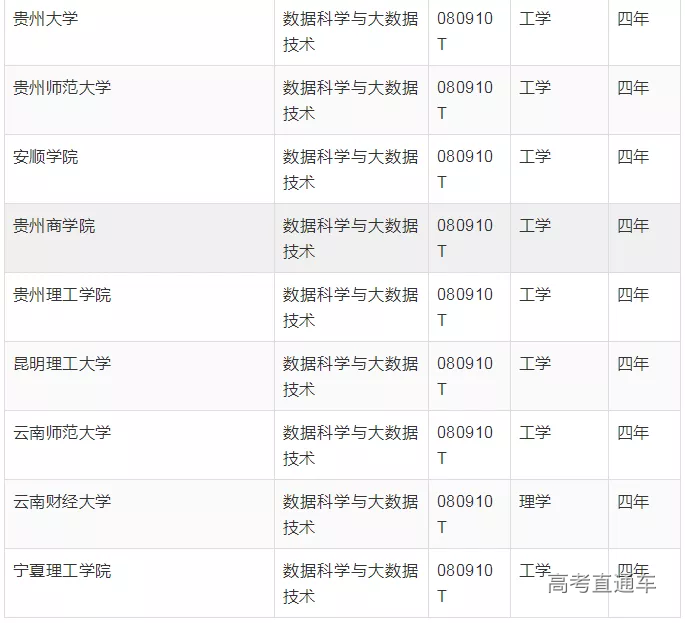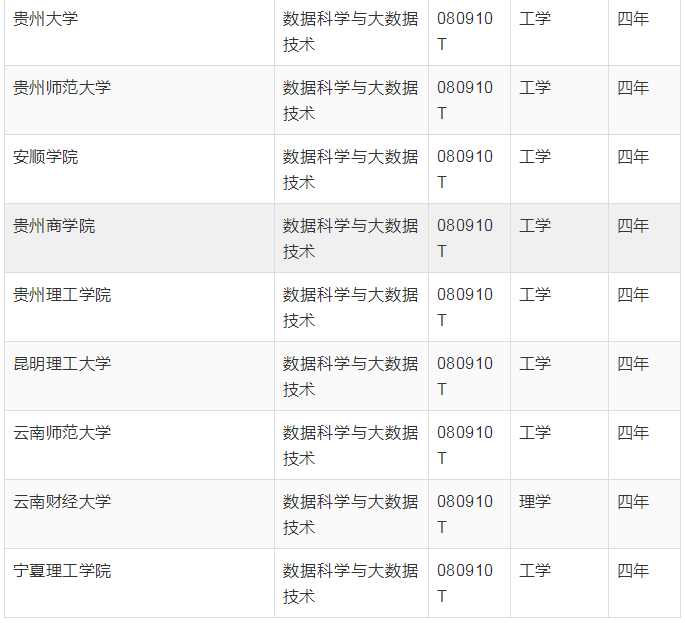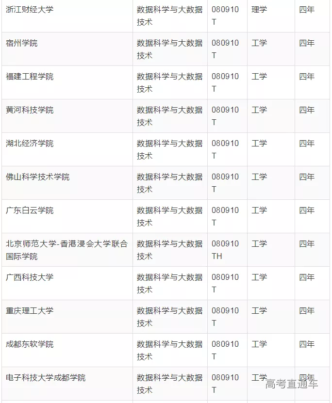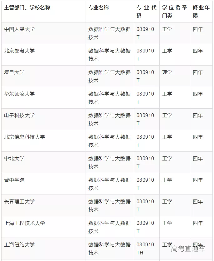 两次获批的”数据科学与大数据技术专业”名单中显示,该专业学制都为四年,大部分为工学。