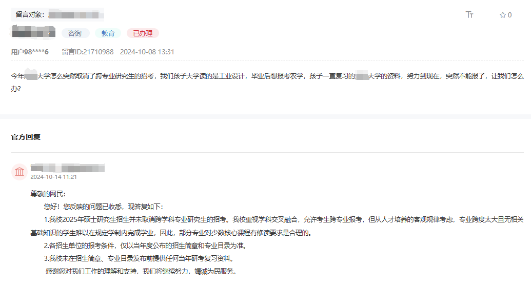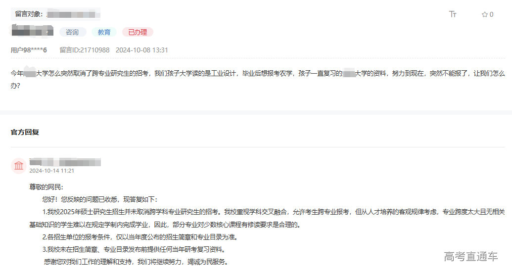 近日,有网友通过人民网“领导留言板”反映:“今年某211大学突然取消了跨专业研究生的招考,我们孩子大学读的是工业设计,毕业后想报考农学,一直复习这所大学的资料,突然不能报了。”