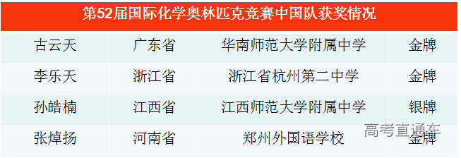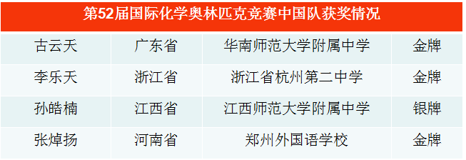 经过5个小时理论考试的紧张角逐,本届IChO共产生26枚金牌、50枚银牌和37枚铜牌,中国代表队不负众望,古云天、李乐天、孙皓楠、张焯扬4名同学都取得非常优秀成绩,荣获三金一银。其中,古云天同学更是取得全球第三名的佳绩!