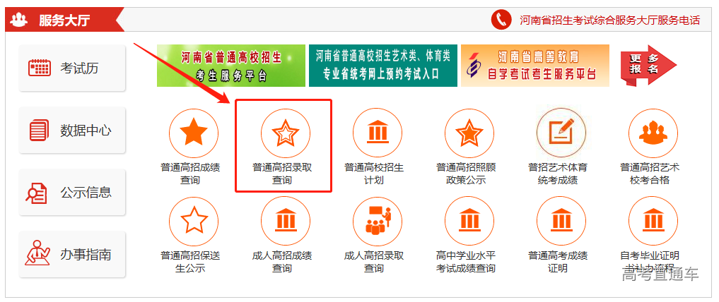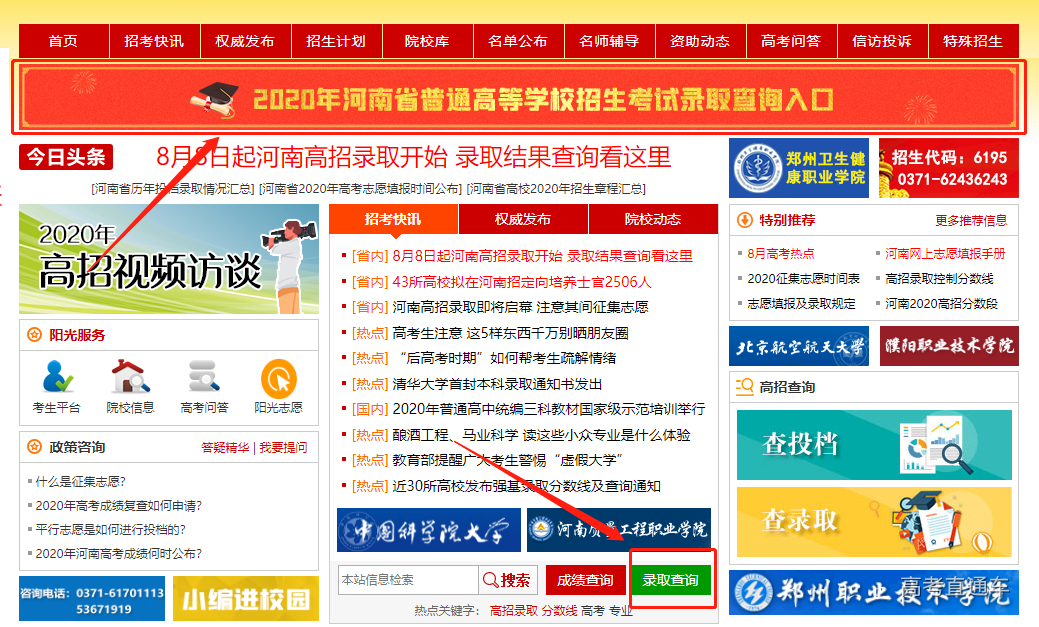 进入河南省阳光高考信息平台(http://gaokao.haedu.cn/),点击上方头部横幅图片,或者点击页面中下方的“录取查询”。
