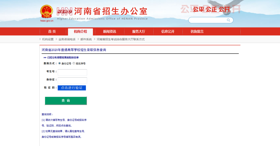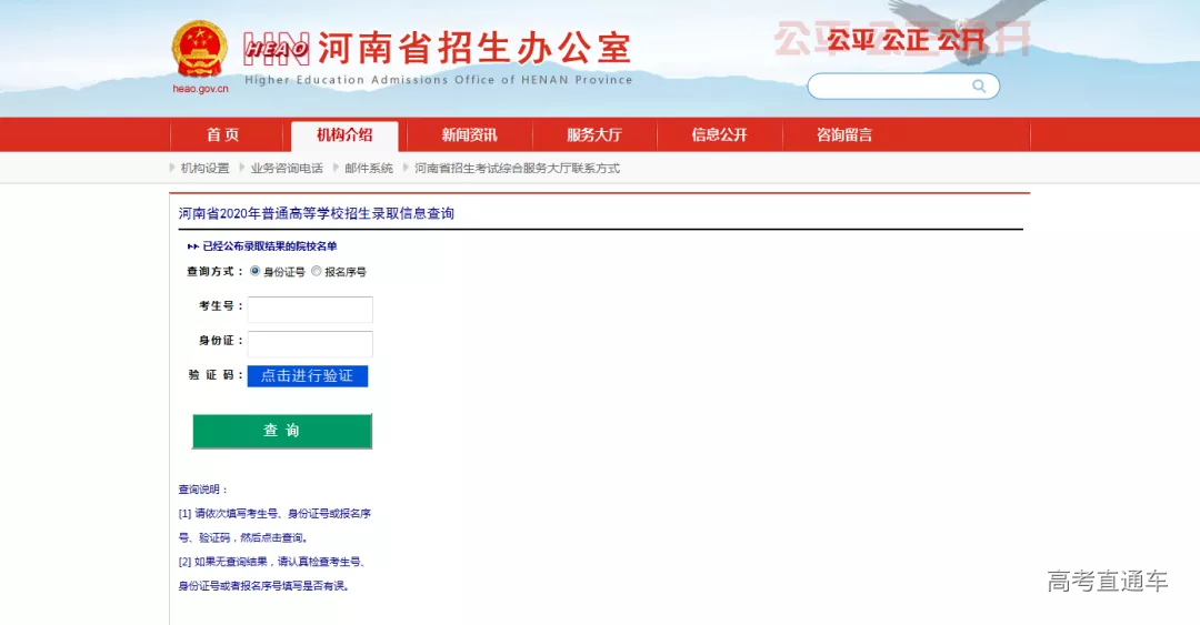 考生登录河南省招生办公室(http://www.heao.gov.cn/),点击“普通高招录取查询”。