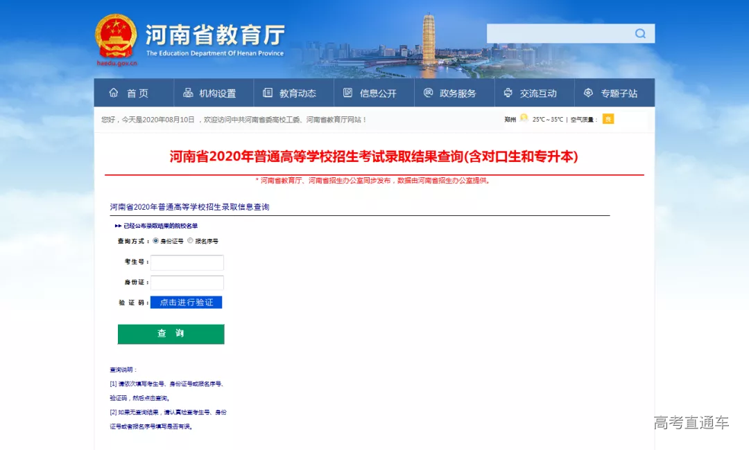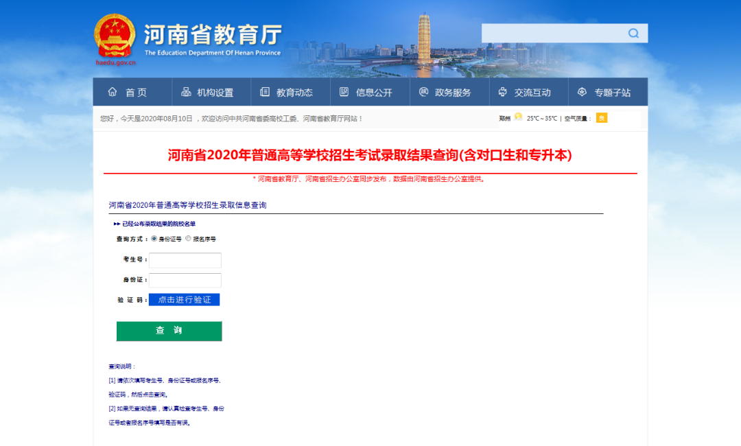 考生登录河南省教育厅(http://www.haedu.gov.cn/),点击“教育查询”中的“高考录取查询”。