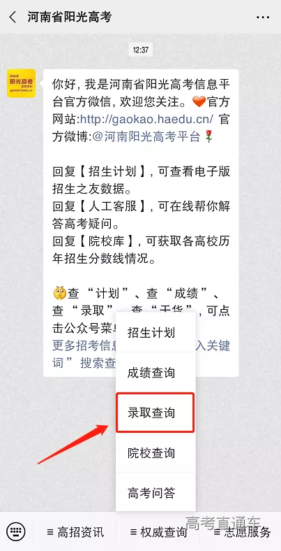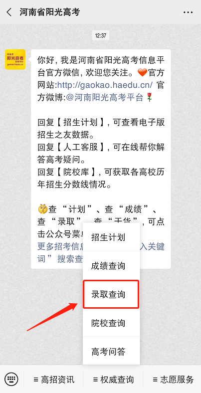 关注“河南省阳光高考”微信公众号(yggaokao),点击菜单栏“权威查询”中的“录取查询”,可以轻松在线查询!