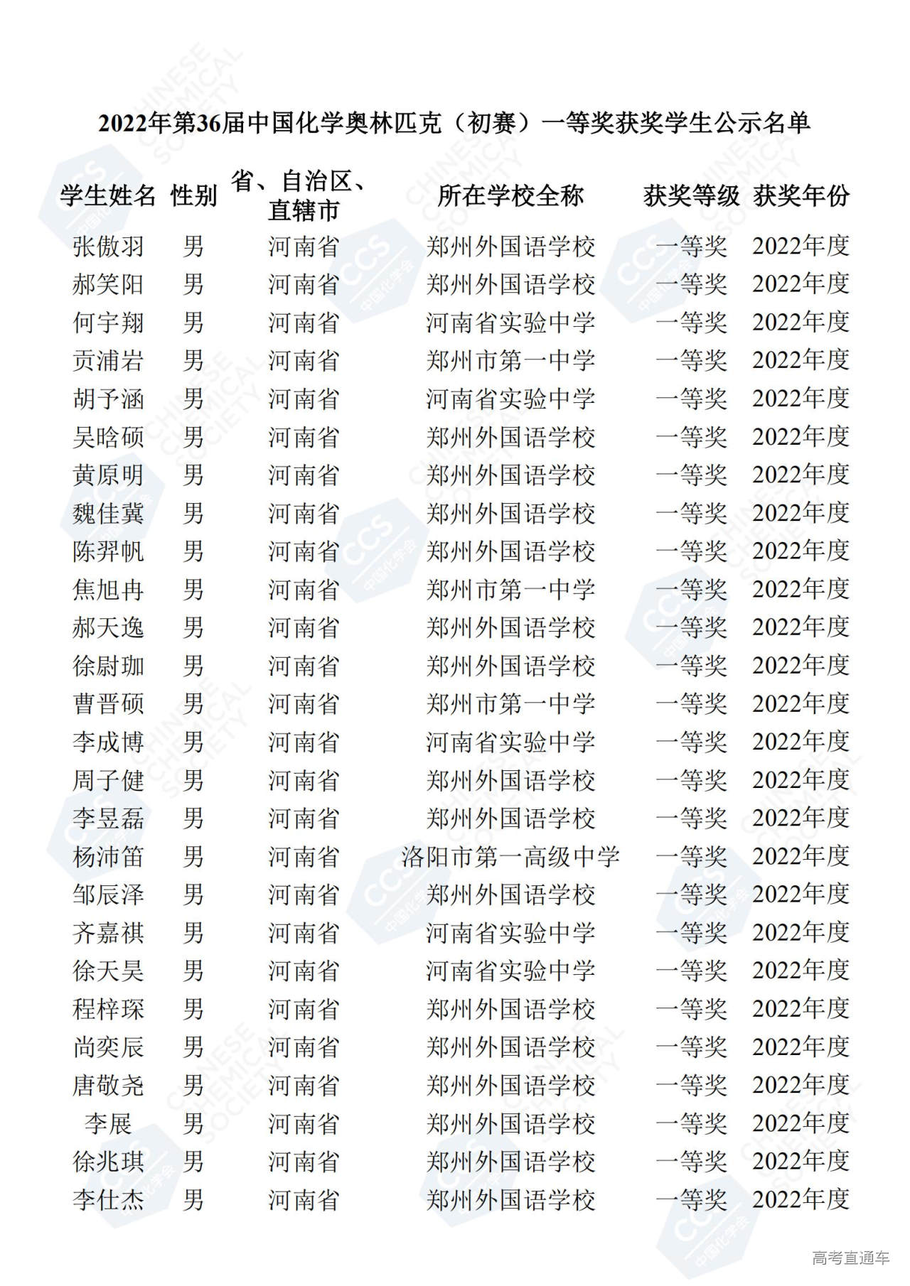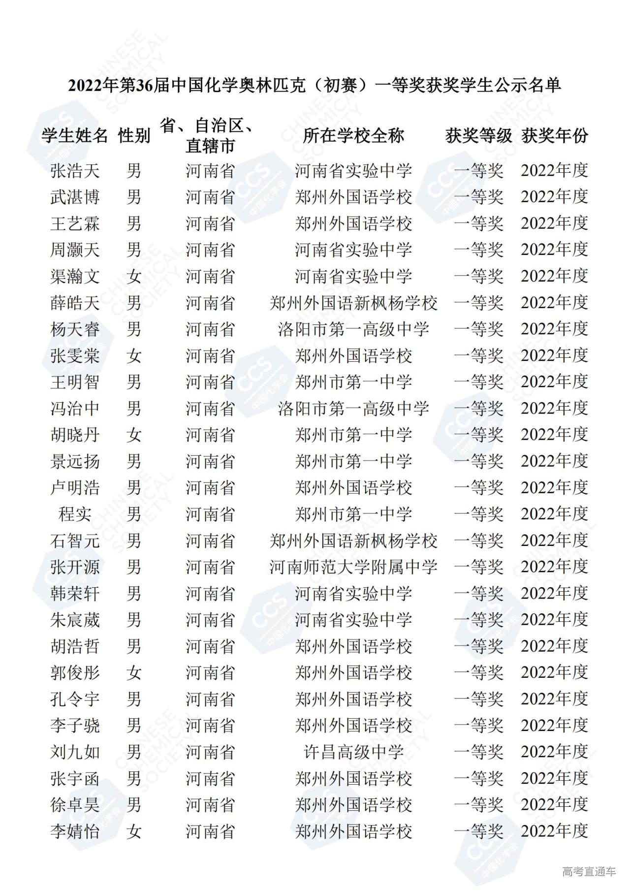 第36届全国中学生化学竞赛初赛省一获奖名单(河南赛区)
