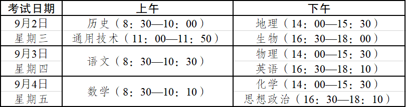 一、文化课考试科目:语文、数学、英语、思想政治、历史、地理、物理、化学、生物、通用技术共10个科目。考试时间为2020年9月2日至9月4日:共3天,具体时间安排见下表: