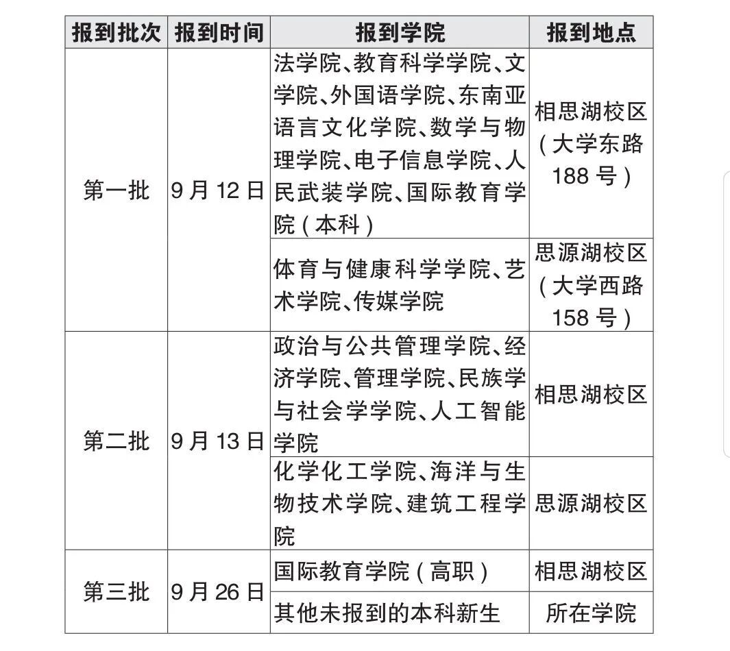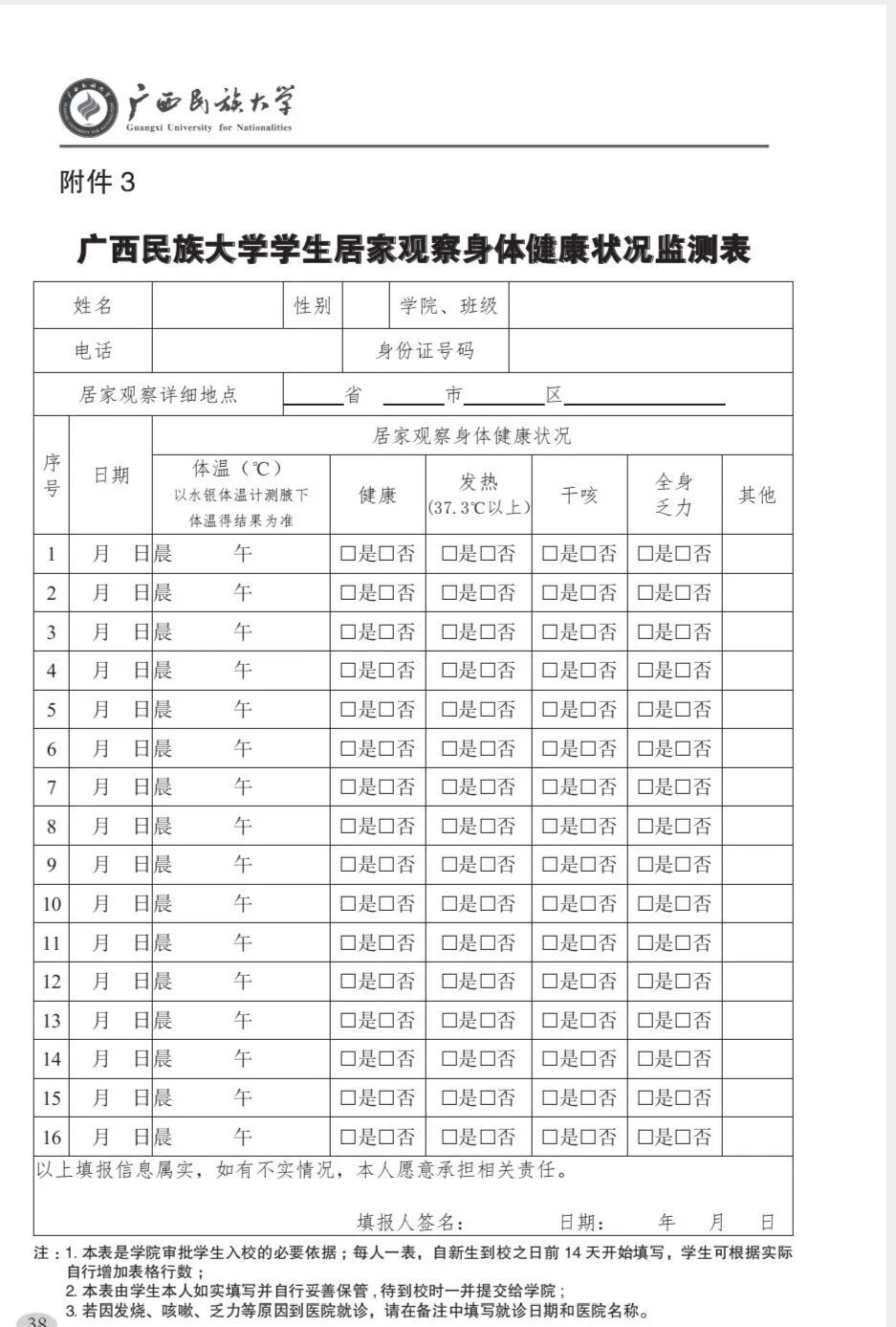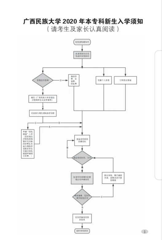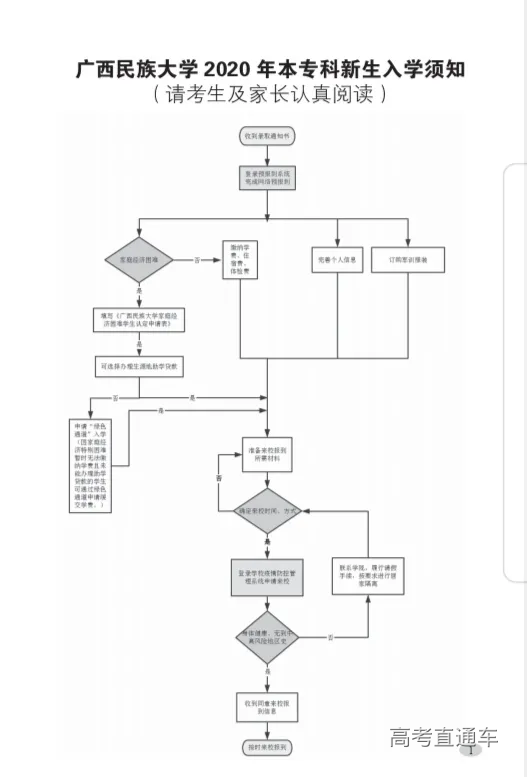 一、报到时间、方式、地点及疫情防控要求 ( 一 ) 网络预报到 1. 时 间 :本科新生,8 月 28 日—9 月 8 日 ; 高职新生,9 月 19 日—23 日。 2. 方 式 (1) 移动 APP ①访问移动校园页面地址 http://ydxy.gxun.edu.cn:8090/webconsole/ydxy/promotion 或者扫描二维码下载掌上校园 APP ; ②下载安装掌上校园 APP 后,输入账号(身份证号作为账号)和密码(身 份证号后六位); ③登录掌上校园 APP 后,点击“应 用”→“学生工作”→“移”→“学生工作”→“移动迎新”, 进入移动迎新界面 : ◆点击“个人信息填写”,输入相关信息完成预报到 ; ◆点击“军训服装订购”,输入衣服及鞋码尺寸,订购 军训服装 ; ◆如需要申请绿色通道可点击“绿色通道”,输入个人 信息并上传证明材料,提交学校审核。(“绿色通道”:因家 庭经济特别困难暂时无法缴纳学费且未能办理助学贷款的 学生可通过绿色通道申请缓交学费,直接报到入学,下同。) (2)PC端登录迎新服务网 (http://zhxg.gxun.edu.cn/yxwz/index. do),输入“考生号”+ 身份证号后六位登录迎新平台,根 据迎新服务网提示,完成网上报到、军训服装订购、申请“绿 色通道”。 ( 二 ) 来校报到 1. 来校申请。请统一于来校前 3 天,登录学校疫情防 控管理系统提交来校申请,审批通过后方可入校 ;未经批准, 学生一律不得提前来校报到。 (1) 申 请 方 式。 电 脑 登 录 学 校 疫 情 管 理 防 控 系 统 https://backtoschool.gxun.edu.cn/epidemic-mobile/ newStudent, 输入“考生号(或身份证号)”账号 + 身份 证号后六位为密码登录 , 进入入校申请,或用手机登录 掌上校园 APP,点击“应用”→“学生工作”→“入校 申请”。 (2) 上传材料。上传个人“健康码”(绿码)截图、“通 信大数据行程卡”(可通行状态)截图和《广西民族大学 学生居家观察身体健康状况监测表》( 拍照 ) 到学校疫情 防控管理系统审核,如返校前 28 天有中高风险地区和境 外旅居史的,还须上传近 7 天内核酸检测阴性结果证明材 料(拍照)。 (3) 学校审核。审核结果会通过手机短信进行反馈,如 收到“审核不通过”短信,请根据提示内容修改申请材料 后重新提交审核。 2. 报到时间及地点。受新冠肺炎疫情影响,2020 级新 生实行错时错锋分批开学 : ( 三 ) 疫情防控要求 1. 所有学生来校前 14 天要进行居家健康观察,不参加 聚集性活动,每天监测体温并如实填写《广西民族大学学生 居家观察身体健康状况监测表》; 2. 有以下情况之一的暂缓报到注册,须居家连续健康 监测 14 天,身体状况健康且提供近 7 天内核酸检测阴性结 果证明材料,方可提出来校申请 : (1) 来校前 28 天内学生本人或家庭成员被确诊为新冠 肺炎或疑似病例的 ; (2) 来校前 28 天内学生本人或家庭成 员与新冠肺炎确诊、疑似病例有密切接触的 ; (3) 来校前 28 天内有中高风险地区和境外旅居史的 ;(4) 来校前有发热或 呼吸道等疑似症状(发热、咳嗽、咽痛、胸闷、呼吸困难、 乏力、恶心呕吐、腹泻、结膜炎、肌肉酸痛等); (5) 尚未 解除医学观察的 ; 3. 暂缓报到注册的学生,应向所在学院履行请假手续 ( 各学院联系人及联系电话,请登录预报到系统查阅 ) ; 4. 来校途中,全程佩戴一次性医用口罩或医用外科口 罩、手套,保持手部卫生,尽可能减少接触公共物品或部位, 尽可能减少与同乘人员密切接触 ;建议有条件的学生乘坐 私家车来校,私家车到达指定校门口即停即走,除学生本 人外,其他随同人员一律不得入校 ; 5. 请自行准备一定数量的口罩、消毒液、体温计等防 护用品,自备饭盒(有盖)、筷子等个人餐具 ; 6. 来校途中实行从家门到校门闭环管理,不允许擅自 改变行程。 二、新生报到时需提交以下材料 ( 一 ) 相关身份证明 新生录取通知书、居民身份证复印件 ( 需提供原件审核 )、高考准考证、中学档案(持录取通知书到毕业中学或 当地档案管理单位索取,档案袋须密封并加盖密封章)、一 寸白底大头相 14 张(身份证规格的彩色相片)。 ( 二 ) 党团组织关系 中共党员。广西壮族自治区内转接党员组织关系, 应通过“全国党员管理信息系统”进行,从网上转入到所 录取学院党委 ( 党总支、直属党支部 ),如“广西民族大学 XX 学院党委 ( 党总支、直属党支部 )”;从广西壮族自治区 外转入的,需持原所在单位组织部门开具的《中国共产党 党员组织关系介绍信》,其中介绍信抬头开具为“广西壮族 自治区党委教育工委组织部”,去往单位为“广西民族大学 XX 学院”。新生党员报到时,应主动向辅导员说明组织关 系转接情况,辅导员汇总后交学院党委集中审核。 共青团员。需提交团籍档案 ( 含入团志愿书、入团 申请书、团员证、团内奖励或处分材料等,需密封并加盖 密封章 ) ;特殊情况无法提交团籍档案,需提交由原就读学 校团组织开具的《团员团组织关系介绍信》,《团员团组织 关系介绍信》应写明转入的具体学院团组织名称,如“共 青团广西民族大学 ×× 学院委员会”,并在报到两周内补 充提交团籍档案 ;新生经核查认定团员身份后,在一个月 内通过“智慧团建”系统办理团组织关系转移。 (三) 兵役登记相关证明 ( 男生 )。凡年满 18 周岁的 男性公民,入学前必须登录“全国征兵网”( 网址 :http:// www.gfbzb.gov.cn) 进行兵役登记,报到时男生必须提供兵役登记相关证明 ( 男性公民兵役登记 / 应征报名表,可登录全国征兵网打印 )。 (四) 办理生源地信用