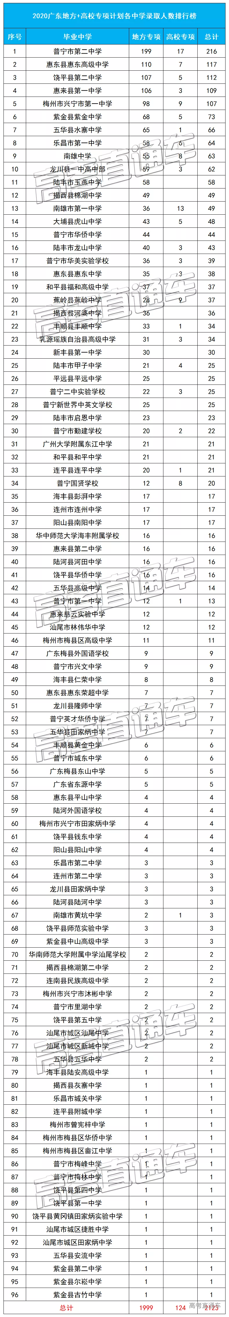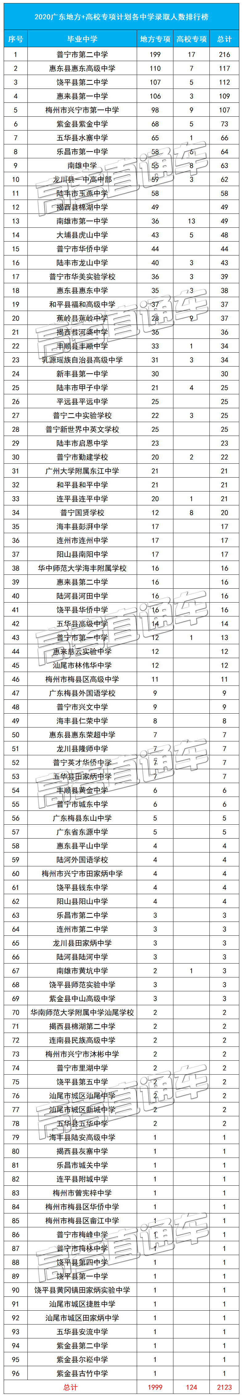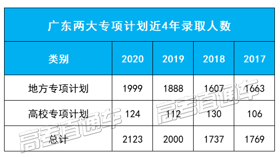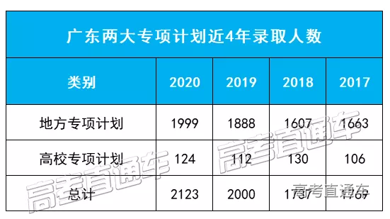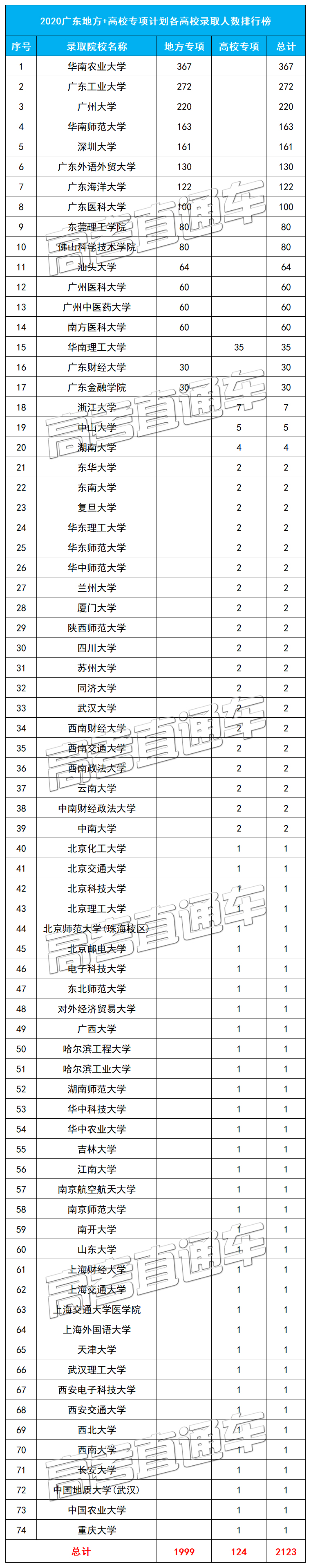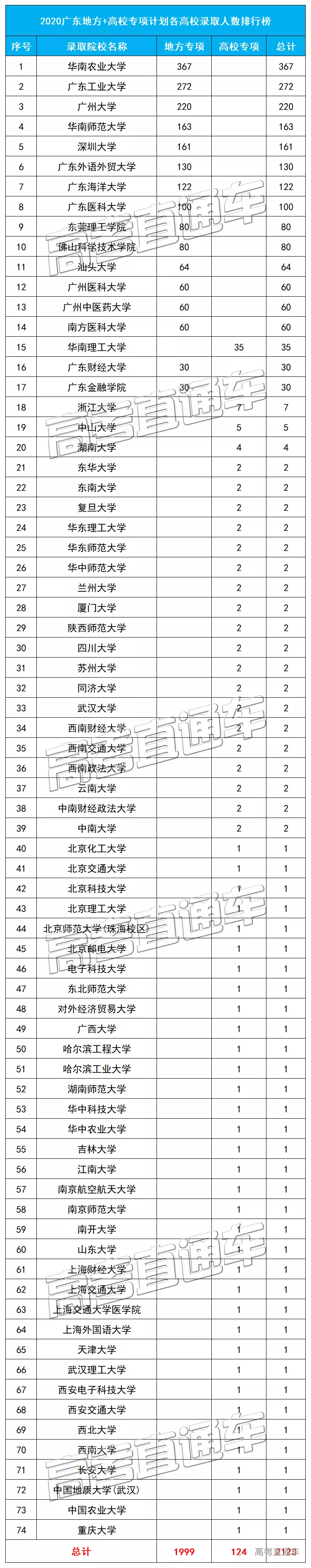 今天,广东省教育考试院公示了2020广东地方专项计划、高校专项计划录取名单出炉,共录取2123人,与前几年相比人数有所增长。 今年共74所大学参与广东两大专项计划录取,其中录取人数最多的是华南农业大学(367人),其次是广东工业大学(272人)和广州大学(220人)。 录取人数比较多的都是地方专项计划,参加高校专项计划的各校的录取名额都比较少,大部分高校都是只有1-2个。但值得一提的是,高校专项计划还要厦门大学、武汉大学、四川大学等广东省外知名院校可以报考。 专业方面,工商管理类、汉语言文学和英语专业最受考生欢迎,占据了专业录取人数排行榜的前三名。 地方专项计划和高校专项计划的区别如下: 1.适用人群 地方专项计划:针对农村户籍考生。 高校专项计划:高校专项计划主要招收边远、贫困、民族等地区县(含县级市)以下农村学生。 2.录取方式 地方专项计划:不需要单独报名和递交其它材料,高考成绩下发后,单独设置志愿填报及录取批次,省招办单独划线,单独录取。 高校专项计划:需要在5月5日前在“阳光高考”平台里单独报名,并提交相应的纸质材料,经过该校专家审核后,于6月13-14日到该校参加笔试和面视(有的学校不需要笔试和面试),合格后享受该校一定的录取分数照顾。 注:在时间上,大家要关注阳光高考发布的动态,不要错过报名时间。 3.录取层次 地方专项计划:只有一本院校(二本院校的一本专业); 高校专项计划:录取的学生必须是一本线的学生。 最后来看看两大专项计划的详细录取考生名单吧 ↓↓↓