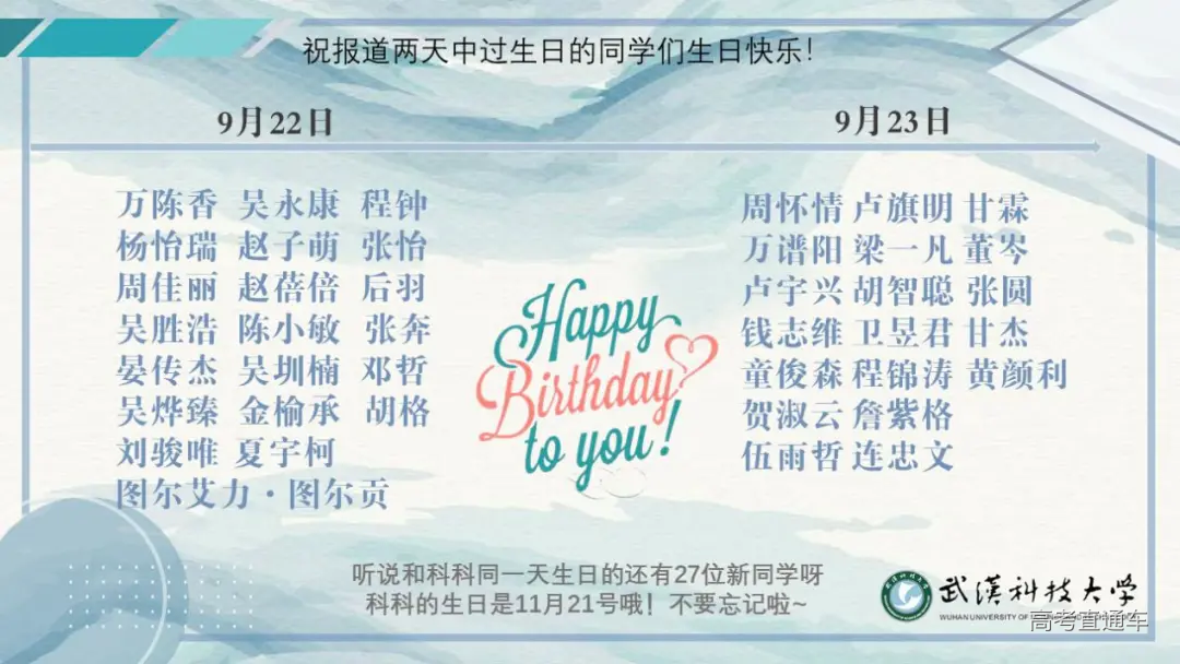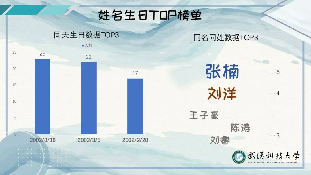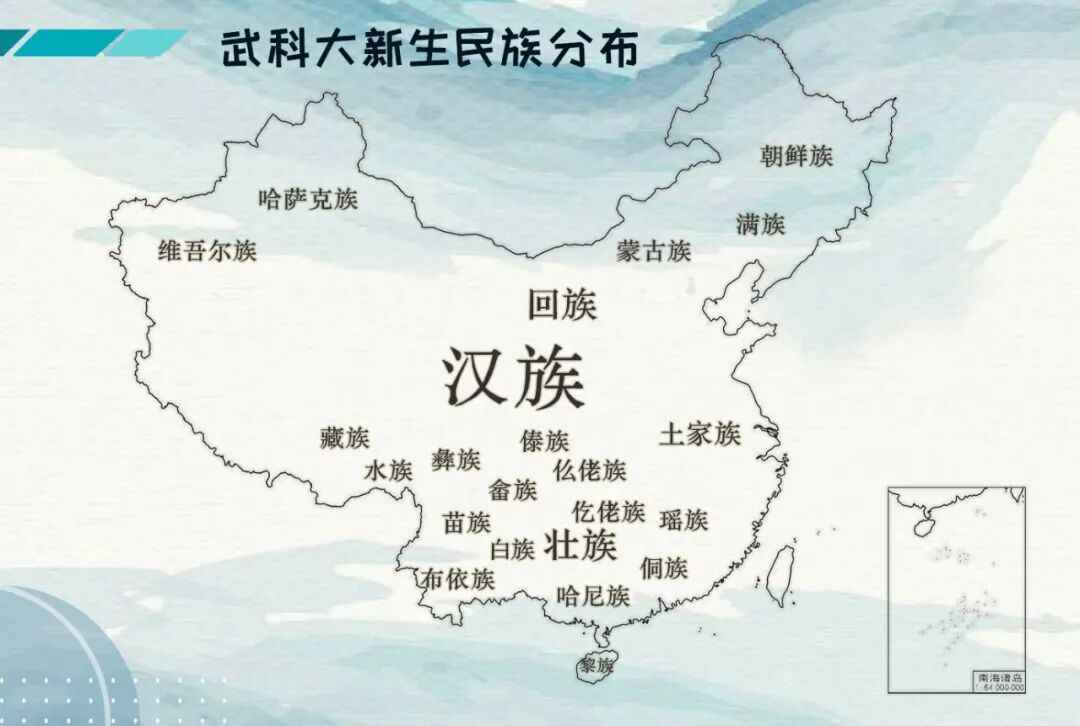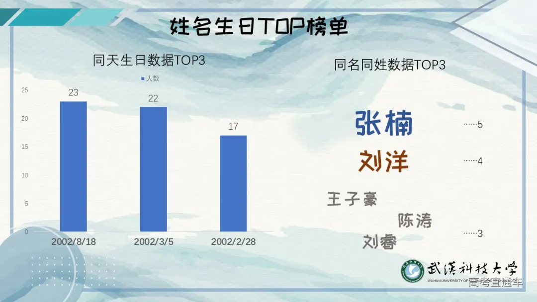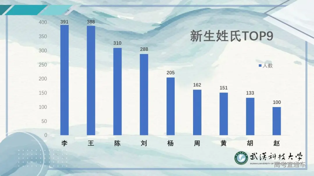 果然 还是湖北的小伙伴居多 北京过来的5个小可爱 不要怕哈 在武科大 我们会像家人一样待你们哈 这一点科科向你保证! 这6000多位新朋友 来自23个民族30多个地区 在武科大的4年甚至更久 相信你们一定会不断汲取营养 开出最美的花朵 加油呀~ 20级新生共有326个姓氏 其中过百位的 不乏有李、王、赵、周等大姓 也有平易近人的陈、刘、杨、黄等形式 独一无二的姓氏有 令狐、上官、定、楚、仰、才、宾等 有一个很好玩的 那就是小萌新们 男多女少的传统 从来没有被打破过 哈哈哈 男孩子们,要加油哟~ 作为男女比例的龙头老大 体育学院以女生VS男生 以1:29取得压倒性胜利 这男女比例大家也看到了 男孩子们! 班级里的累活 多干干哈,要懂得怜香惜玉哟~ 你知道今年的年龄差吗? 是的 是14岁 年龄最大的28岁 年龄最小的14岁 每个人 不同的年龄 不同的际遇 此处相遇 未来精彩 有生之年,有幸遇见 明年的武科大 2月28日 将有17人会一起过生日 3月05日 将有22人会一起过生日 8月18日 将有23人会一起过生日 缘分 原来妙不可言 新生 ——新的人生 我们来自30个不同的城市 来自23个不同的民族 在同一天考取这所学校 遇到了可以一起说生日快乐的人 也许是命中注定吧 武科大 有成体系的教学系统 一流的科研设施 优秀的讲师 科科相信 在大家的不断钻研下 一定会诞生举世瞩目的前沿成果 17个学院 6000多位新生 我们将在这里相遇、相伴、相知 最美的等待 是来日可期 每一次的相遇 叫久别重逢 风里雨里 科科在这里等你