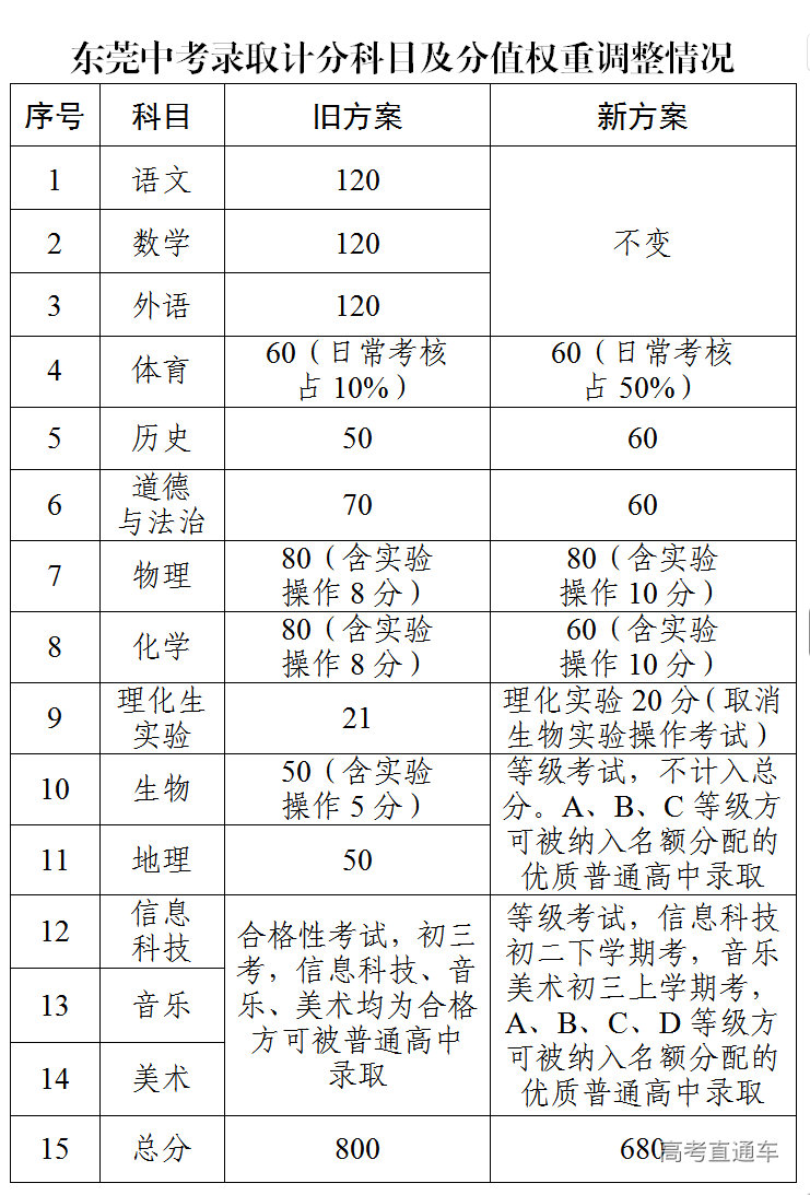 一、减少中考录取计分科目,减轻学生备考负担 从2026年参加初二生物地理会考的学生开始,生物、地理实行等级考试,生物地理成绩不计入中考录取总分;调整后,从2027年起,我市中考录取计分科目从原来的10门减少为8门(语文、数学、外语、物理、化学、历史、道德与法治、体育)。 生物、地理、音乐、美术、信息科技5个等级赋分科目考试结果以“等级+分数”的形式呈现,分A、B、C、D、E五个等级,每个等级所占人数比例分别约为17%、33%、33%、15%、2%。 减少中考录取计分科目,可有效减轻学生的课业压力和备考负担。同时,等级赋分科目等级情况作为高中录取的参考条件和高中阶段学校自主招生的基本条件,可引导学业基础好、对相应学科特别感兴趣、有潜力的学生发展兴趣特长,选择适合自己的发展规划和升学途径。 二、降低中考总分,注重综合素养培育 从2027年起,我市中考招生录取总分由800分降低为680分,避免过度竞争。同时进一步优化各科目分值及权重,落实义务教育课程方案,更好衔接高中课程方案和高考改革趋势。 语数英三科分值不变,权重从45%提高至52.9%,契合高考改革趋势,更突出基础学科地位,激励学生更注重基础知识的掌握,强化学生基础能力。 适当调整道德与法治、历史、物理、化学学科分值占比,匹配各学科课程安排实际,适当减轻学生的学习负担,持续巩固“双减”成果;同时有效衔接新高考综合改革,更有利于普通高中人才培养,更适应国家人才培养战略需求。 体育分值不变,权重从7.5%提高到8.82%,贯彻“健康第一”理念,更好落实《深化新时代教育评价改革总体方案》和“德智体美劳”全面发展的教育方针。 三、体育中考总体难度降低,注重日常锻炼和培养运动兴趣 从2026年体育中考开始,增加现场测试的可选择项目、降低部分现场测试项目的难度。从2025年9月入学的初一学生开始,将每年体质健康测试成绩纳入中考体育成绩;从2028年体育中考开始,中考体育成绩中50%由平时成绩(初一至初三每年体质健康测试成绩)构成。 增加可选项目,降低现场考试难度,增加平时成绩占比,强化体育过程性评价,鼓励学生日常参与体育运动,体会体育锻炼的乐趣,培养体育爱好,养成持续锻炼的习惯,促进学生身心健康。 四、优化招生录取,促进教育均衡公平 逐步扩大将录取名额均衡分配到各初中学校的优质普通高中范围,将新增的优质普通高中纳入名额分配,保障更多镇街学校初中毕业生升入优质高中,进一步促进教育均衡。 落实省中考改革文件要求,自2025年就读初一的学生起(自2028年中考起),初中阶段中途转学的考生不能参与名额分配录取,防止在优质初中就读的学生临时转学到薄弱初中参加中考、占用薄弱初中名额分配指标,保障薄弱初中学生升学权益。同时,坚持“以人为本”的改革原则,针对因户籍迁移由教育部门统筹安排入学(需整个初三年级在中考报名学校就读)或因身心健康等特殊原因经教育部门批准转学的学生,经严格审核后可按规定享受名额分配。 考虑未来几年我市中考考生数仍将持续增加,为保障应届初中毕业生升学权益、缓解升学压力,在加大力度新建扩建高中学校、大幅增加高中学位供给的同时,从2027年起限制往届生报考公办普高,更好促进教育公平、维护中考招生秩序,也更符合义务教育阶段教育教学规律。 教育改革是一项系统工程,市教育局将深入贯彻国家、省关于教育综合改革的精神和全市教育大会部署安排,在深入推进中考改革的同时,守正创新加强思政教育,推动校家社协同育人“教联体” 全覆盖,逐步推广义务教育学校每周半天校外(特色)活动,全面推行“周三无作业日”制度,提档升级集团化办学,推动教育科技人才一体化发展,探索建立教育体制改革试点,惠及东莞广大学生,为全国、全省教育体制改革提供鲜活经验。