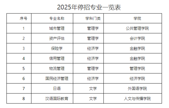 浙江财经大学:2025年停招城市管理、资产评估、保险学、信用管理、物流管理、国民经济管理、日语、汉语国际教育等8个专业;撤销公共事业管理、数字媒体艺术等2个专业。