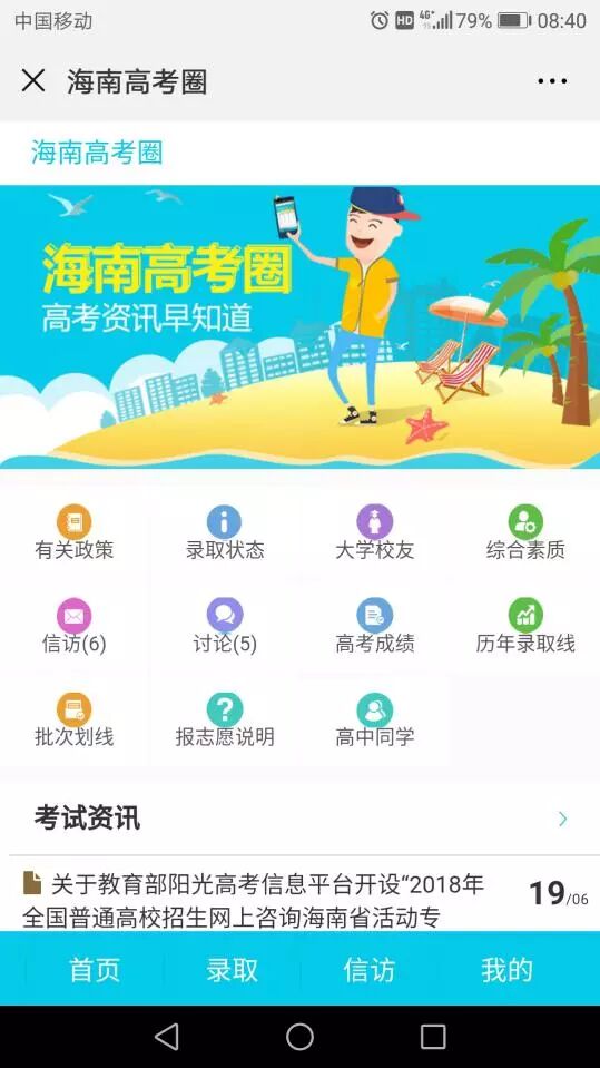 考生可通过微信关注海南省考试局政务微信“海南考试”(微信号:hnkswx),进入“高考服务”->“高考圈”菜单,打开高考圈系统后在“录取状态”模块查询。