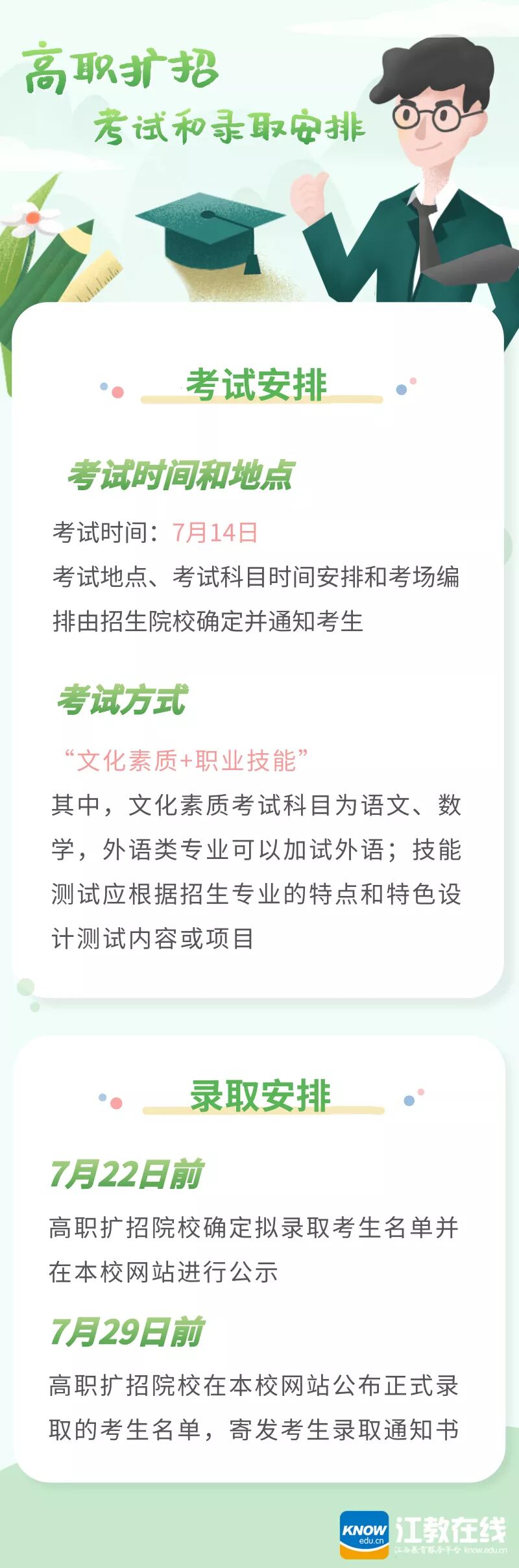根据我省高职扩招工作安排,在今年10—11月还将专门组织面向退役军人和下岗失业人员、农民工、新型职业农民等人员的高职扩招报名和专项考试录取,免予文化素质考试,由各校自行组织与报考专业相关的职业适应性测试或职业技能测试,有关实施办法另文通知。