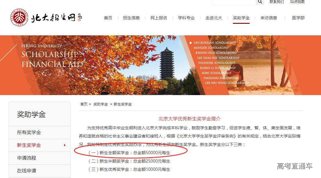 11月26日讯:近日北京大学公示2017年新生奖学金名单,根据评选规则北京大学将给予一等奖新生5万元奖学金,给予二等奖25000元奖学金,给予三等奖1万元奖学金。从公开公示的数额上貌似是远高于清华大学的新生奖学金。