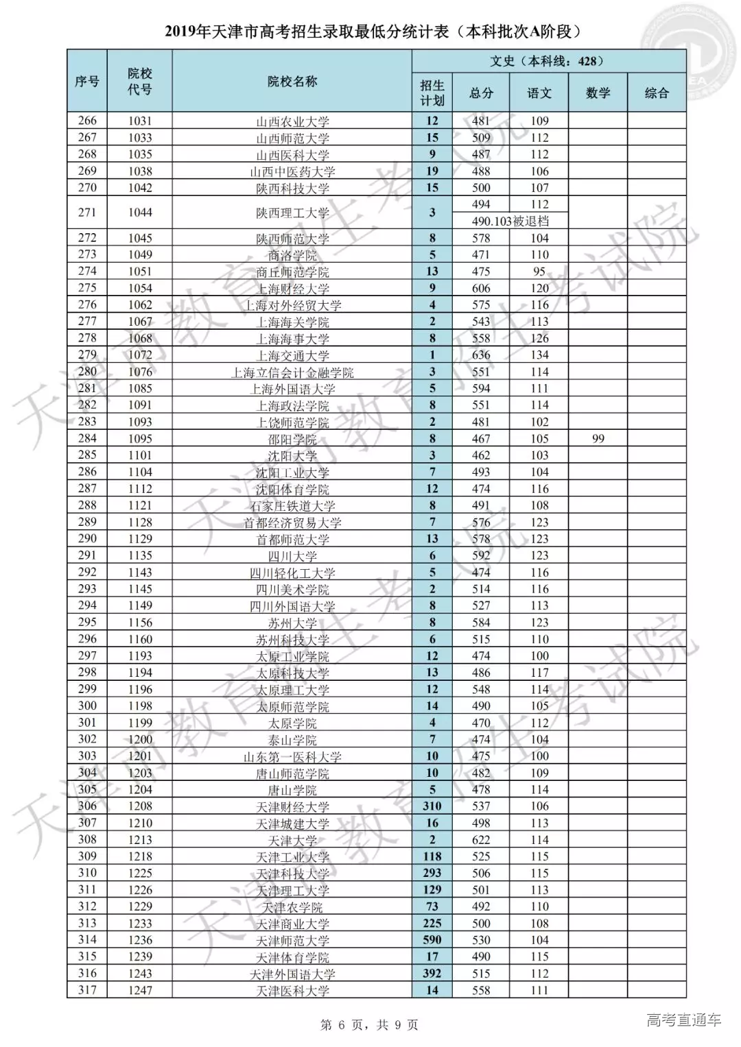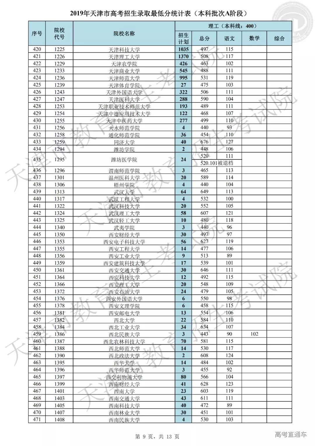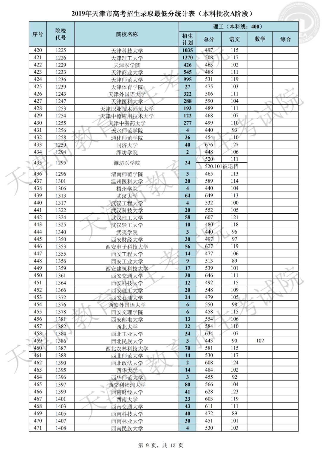 普通本科批次A阶段各院校平行志愿录取最低分